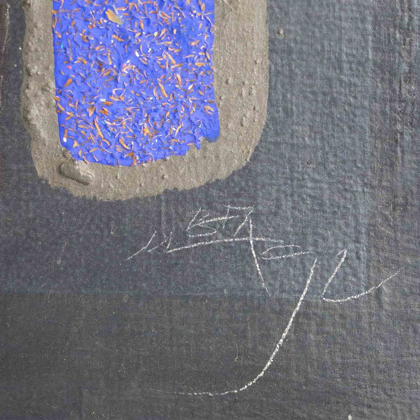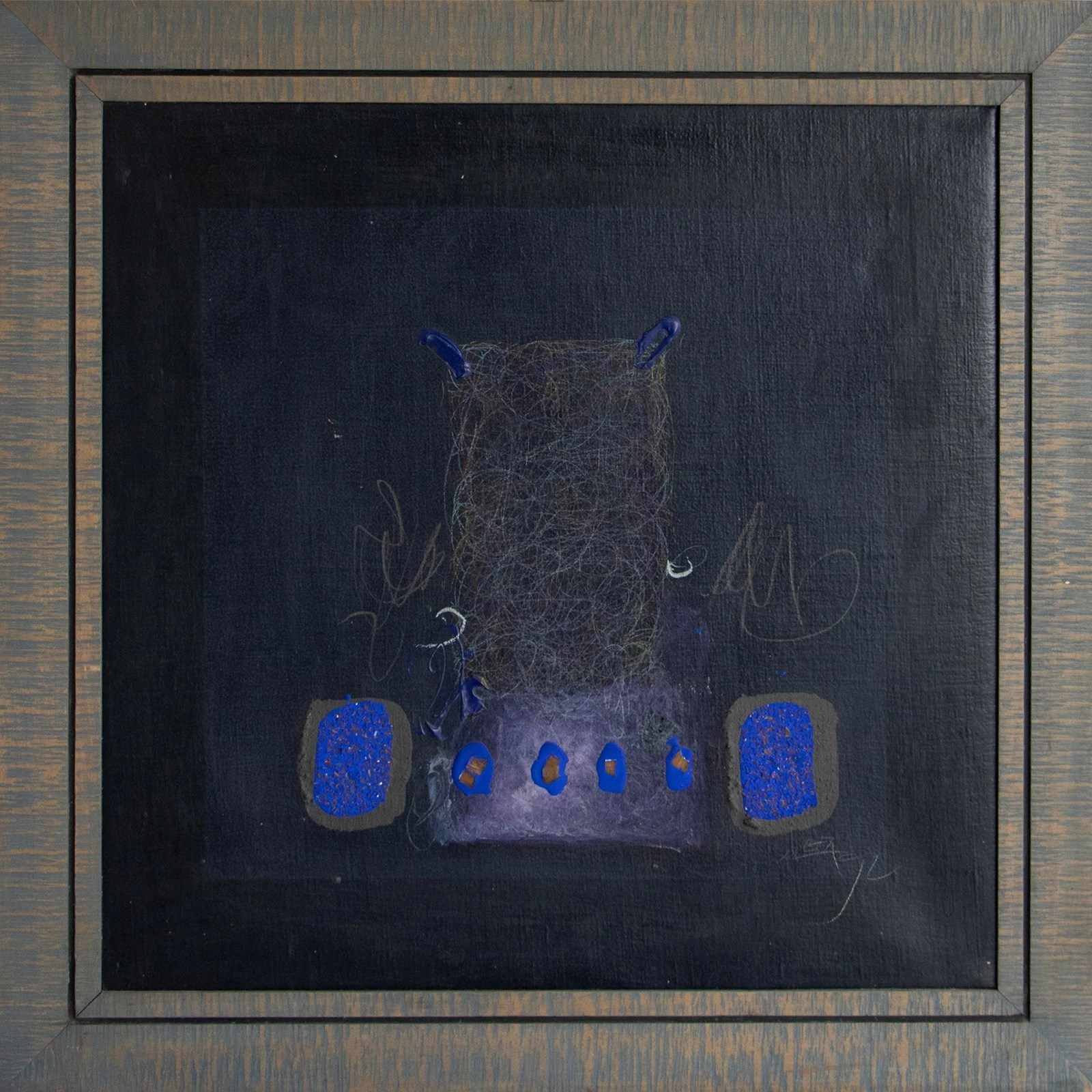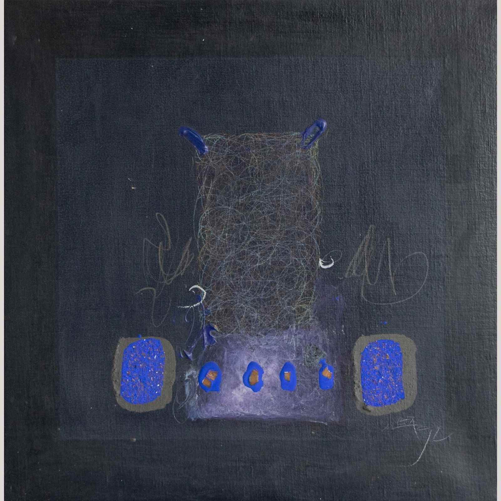 This abstract mixed media work by Manuel Bea Cervera presents a structured arrangement of geometric and organic forms on a dark ground. The surface combines layered pigment, textured material, and embedded organic fragments, creating areas of relief and contrast. Cobalt blue shapes punctuate the composition and are balanced by grey and earthy brown elements. A central vertical form anchors the composition, while repeated motifs along the lower section establish visual rhythm. Incised lines and gestural marks remain secondary to the material construction, emphasizing surface and structure over depth.