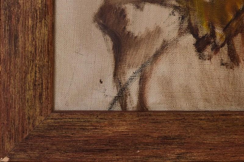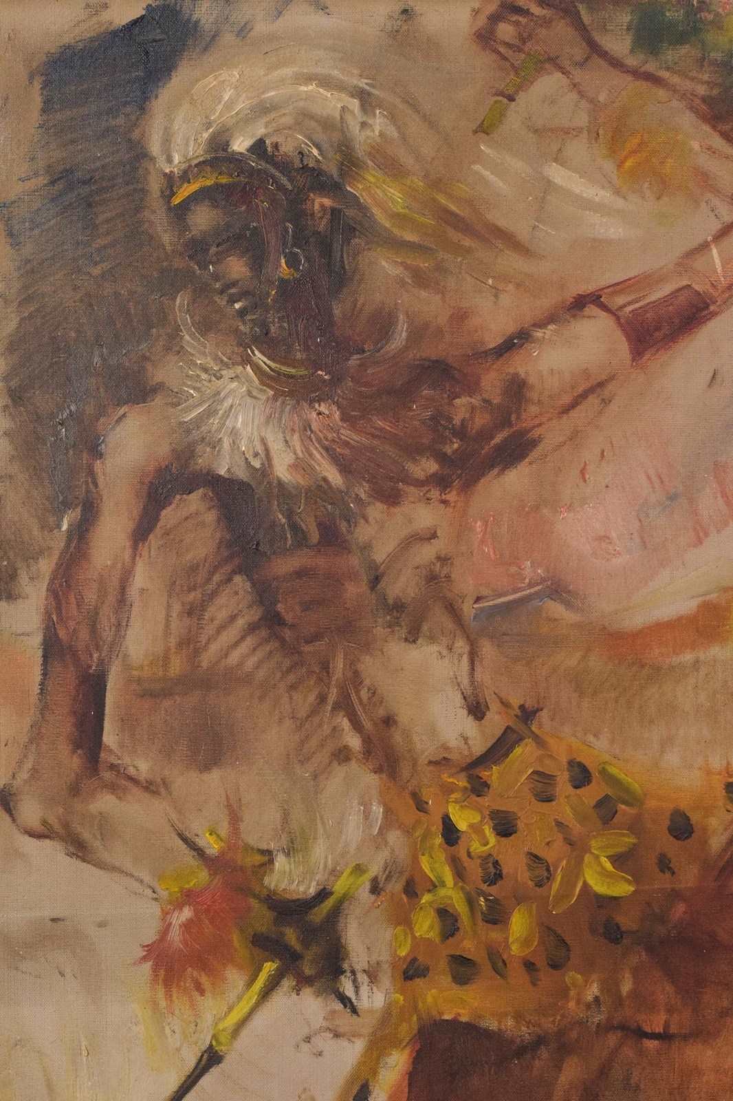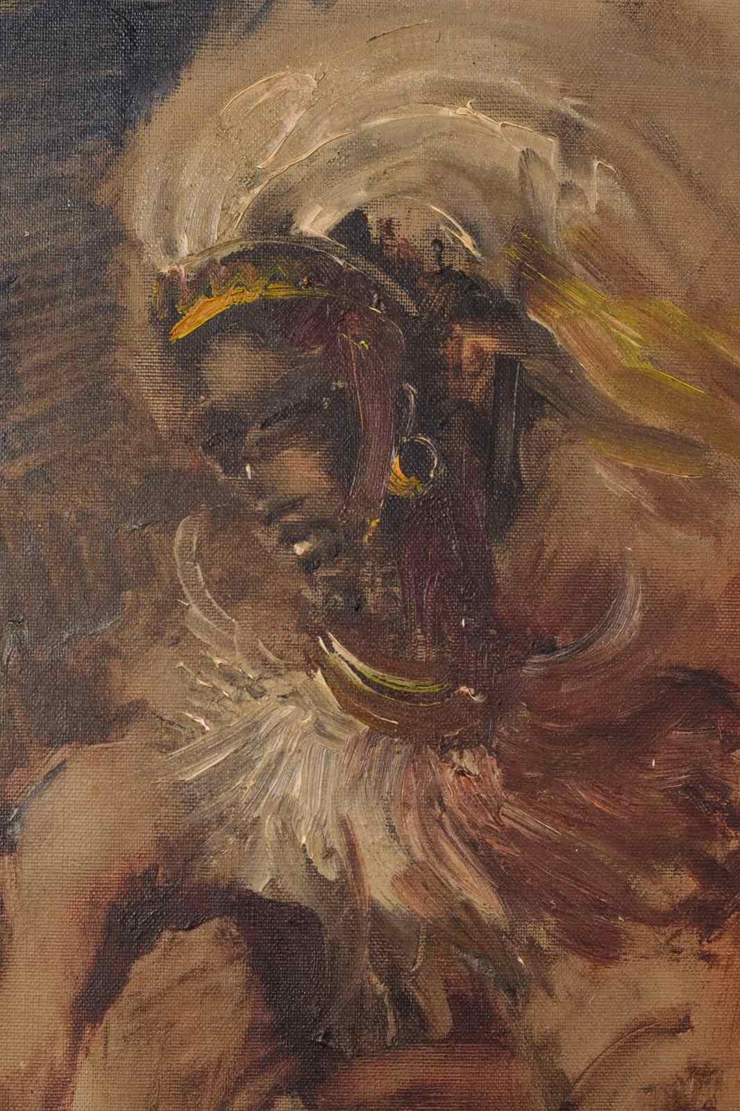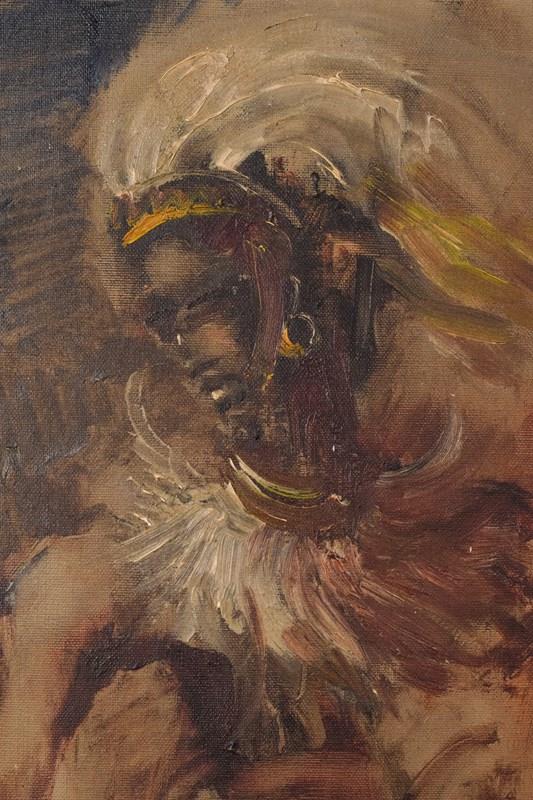 A rich atmospheric work expressing movement and the colours of his terrain. The painter has skilfully captured his magnificent head dress and jewellery. A great use of oil wash for elements of the background.
