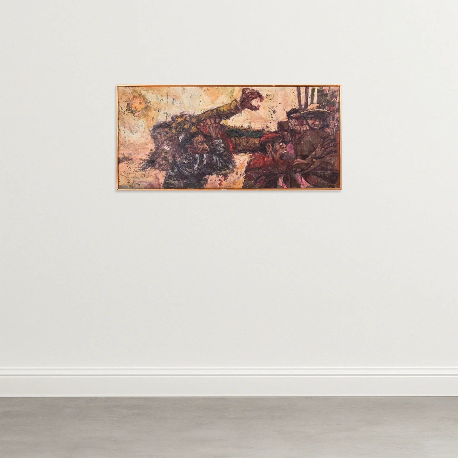 This highly theatrical painting is alive with frenetic energy and movement. We can feel the drama and noise emanating from the canvas, captured by these unforgiving brush strokes and daring palette. A dynamic statement piece to add some energy to your space.
