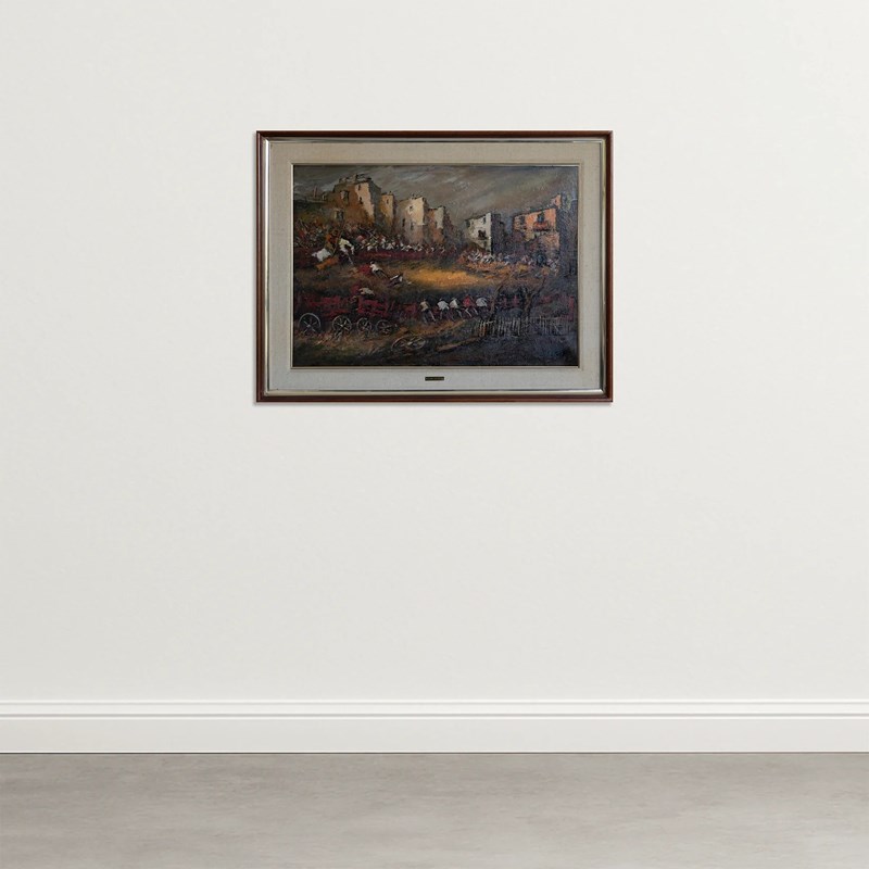 Juan Escoda Corominas presents a powerful oil on canvas composition depicting a bullring scene charged with movement and collective intensity. The painting captures the spectacle unfolding against an urban backdrop of compacted buildings beneath a dramatic, unsettled sky. Executed with expressive, textured brushwork, the surface is built from layered strokes that dissolve detail in favor of atmosphere and momentum. A restrained yet forceful palette of ochres, deep reds, earthy browns, and muted blues reinforces the emotional gravity of the scene, while passages of light cut through the darker tonal field to guide the viewer’s eye. The composition prioritizes rhythm and mass over individual figures, evoking the visceral energy of public ritual rather than literal narration. Rooted in mid-20th-century Spanish figurative expression, the work reflects a painterly approach concerned with social experience, tradition, and emotional resonance, distilled into a compact and visually concentrated format.