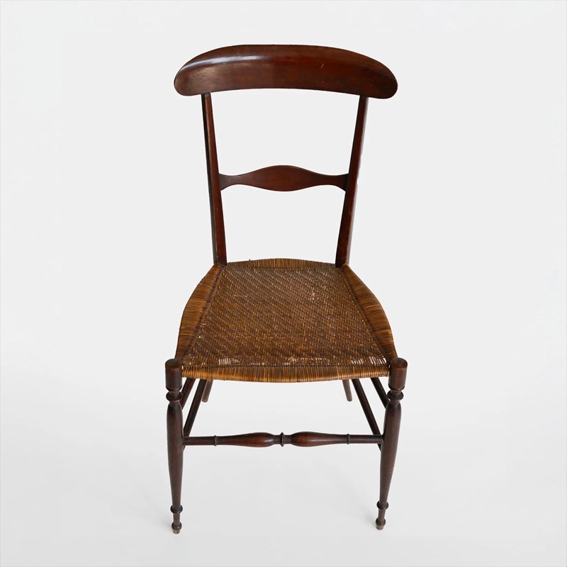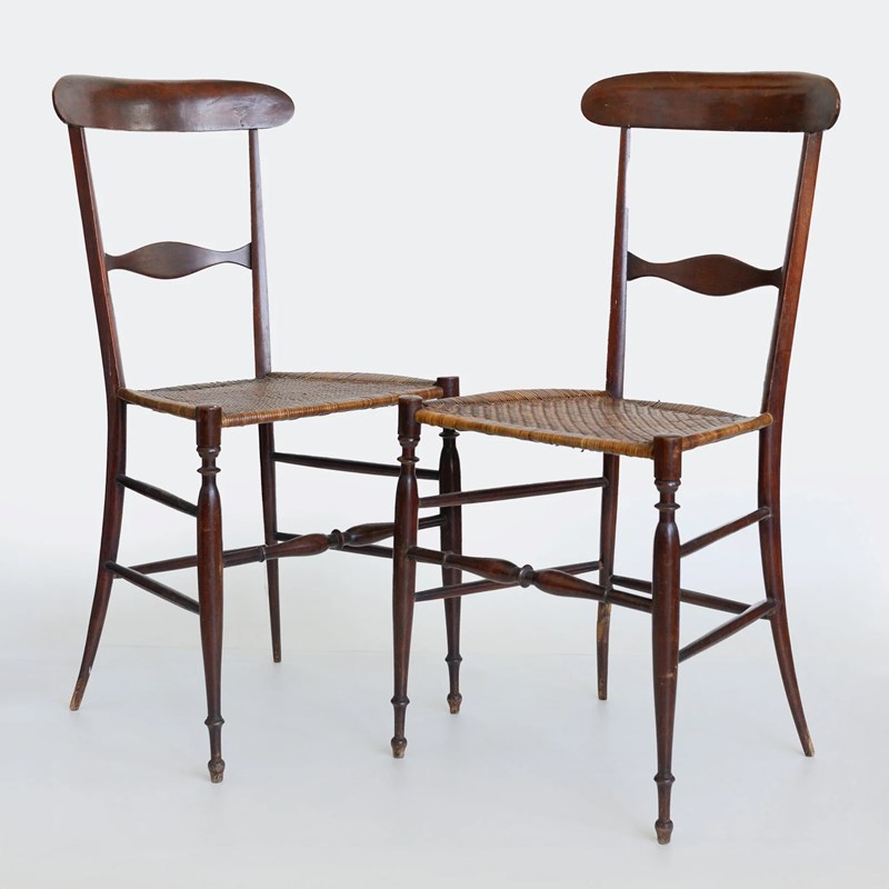 Fratelli Levaggi presents this refined pair of Campanino Chiavari chairs, crafted circa 1950 and exemplifying the lightness and elegance associated with the Ligurian Chiavari tradition. Defined by their slender turned legs, gently arched backrests, and delicately shaped splats, the chairs achieve a remarkable visual balance between strength and grace. The warm patina enhances the sculptural silhouette, while the original handwoven cane seats introduce texture and artisanal character. Rooted in the 19th-century Campanino model yet reinterpreted in mid-century production, these chairs embody both historical continuity and understated modernity. Their airy proportions and fine craftsmanship make them ideal for refined dining settings or curated period interiors.