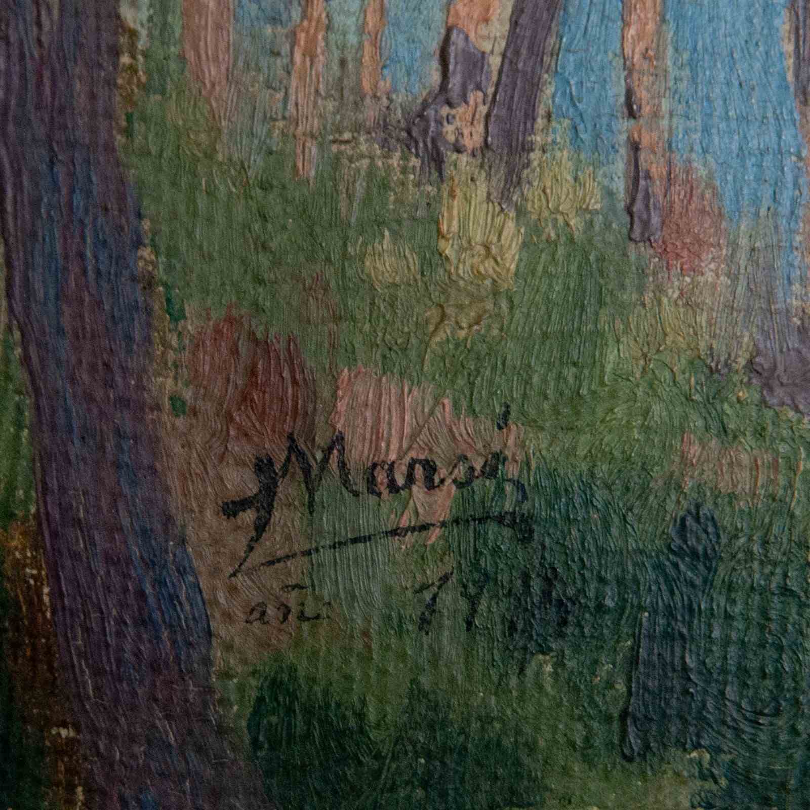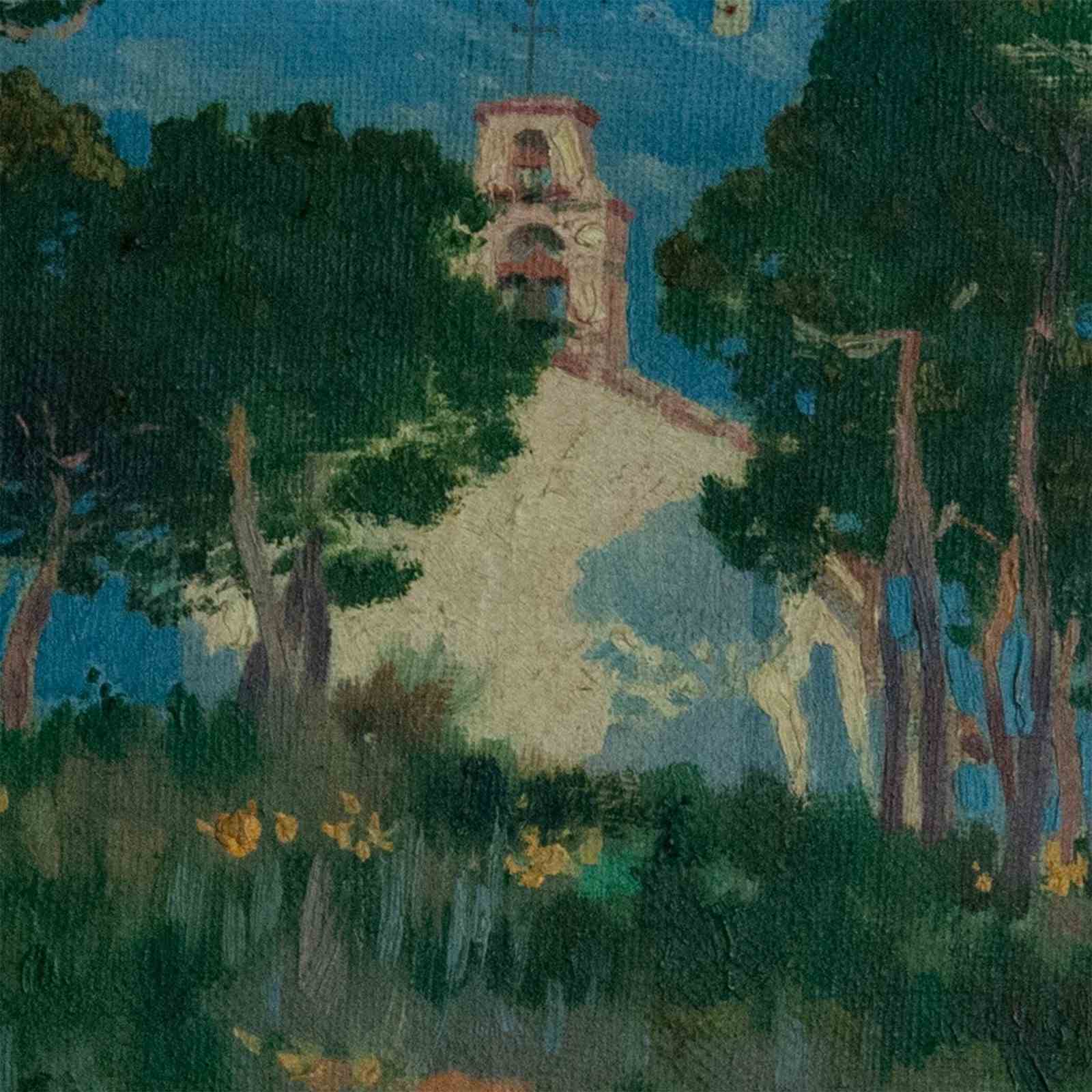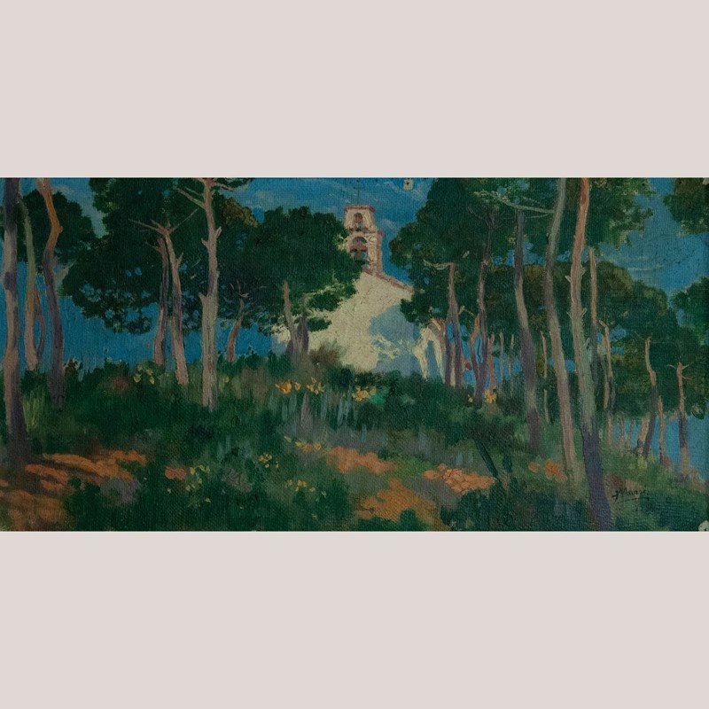 DescriptionThis oil on canvas, signed and dated 1941?, presents a radiant colourist depiction of a hillside chapel surrounded by tall pine trees. The artist employs a vibrant Mediterranean palette of emerald greens, cobalt blues, and warm ochres, transforming the natural scene into a study of light and harmony. The brushwork is fluid yet deliberate, with dappled patches of colour suggesting both foliage and movement. The luminous pathway leading toward the small chapel tower serves as the focal point, framed by the rhythmic verticals of the pines. This interplay of structured composition and expressive tonality aligns with Post-Impressionist and early 20th-century colourist tendencies, where emotional resonance and chromatic balance take precedence over strict realism. The painting radiates a sense of calm vitality and refined elegance. ArtistSigned, artist presently unidentified. Artist DetailsThe signature is presently unidentified. The controlled colour structure and luminous handling of light suggest influence from Mediterranean landscape traditions of the 1930s–1940s, merging Post-Impressionist geometry with the Fauvist intensity characteristic of Catalan and Provençal schools. MovementsPost-Impressionism / Colourism Artist Influenced byInfluenced by the work of Paul Cézanne and the Mediterranean colourists. NO SURPRISE SHIPPING COSTS - UK & EU: Free Shipping - price includes packing, shipping & import VAT. USA & Canada: £170 Special offer packing and shipping price to your door. NOTE: Any import duty is not included. All other destinations: packing & shipping calculated at checkout. FOR PURCHASE & BETTER VIEWING:CLICK ON View Seller Website button BELOW.