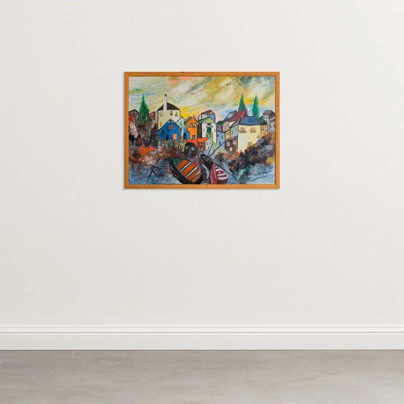 Vibrant and expressive, this oil painting captures a lively Mediterranean harbor at sunset. Bold, textured brushwork and vivid colors bring the clustered village houses and moored boats to life. A beautifully composed piece evocative of Fauvist and Expressionist influences, perfect for adding warmth and energy to any interior space. Signed lower right, attributed to “Moriant” or similar. Framed and ready to hang.