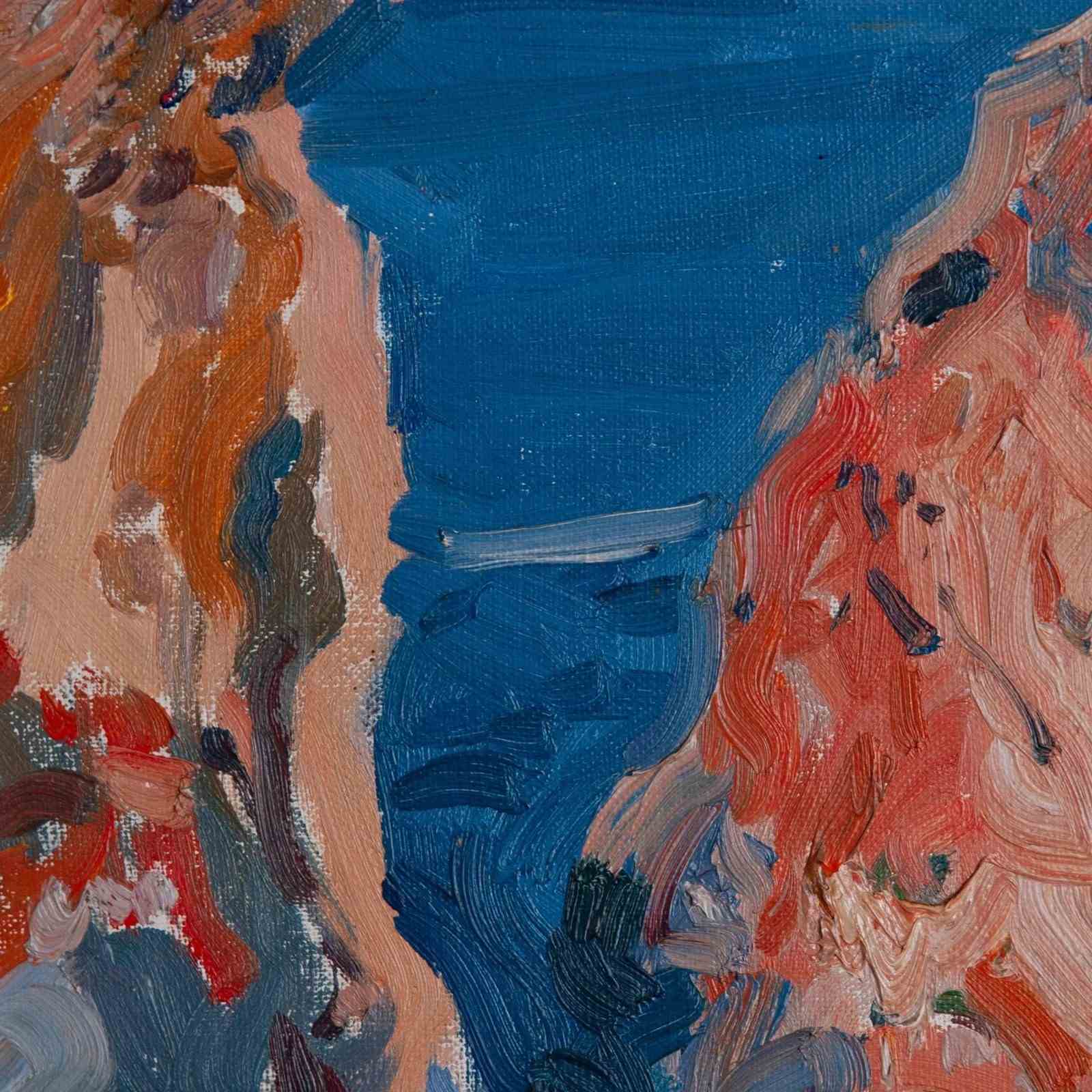 Painted in 1973 by Raimon Roca, this expressive coastal scene exemplifies his mastery of color and movement within the Mediterranean landscape. Using broad, confident strokes and a radiant palette of ultramarine, coral, and violet, Roca captures the sunlit cliffs and tranquil sea with striking immediacy. The textured impasto and fluid brushwork reveal the artist’s sensitivity to natural light and atmosphere, while the composition maintains an elegant balance between structure and spontaneity. This work reflects the height of Catalan colourist impressionism in the 1970s, merging plein air vitality with refined chromatic harmony. A vivid and sophisticated piece that enhances any modern or classic setting.