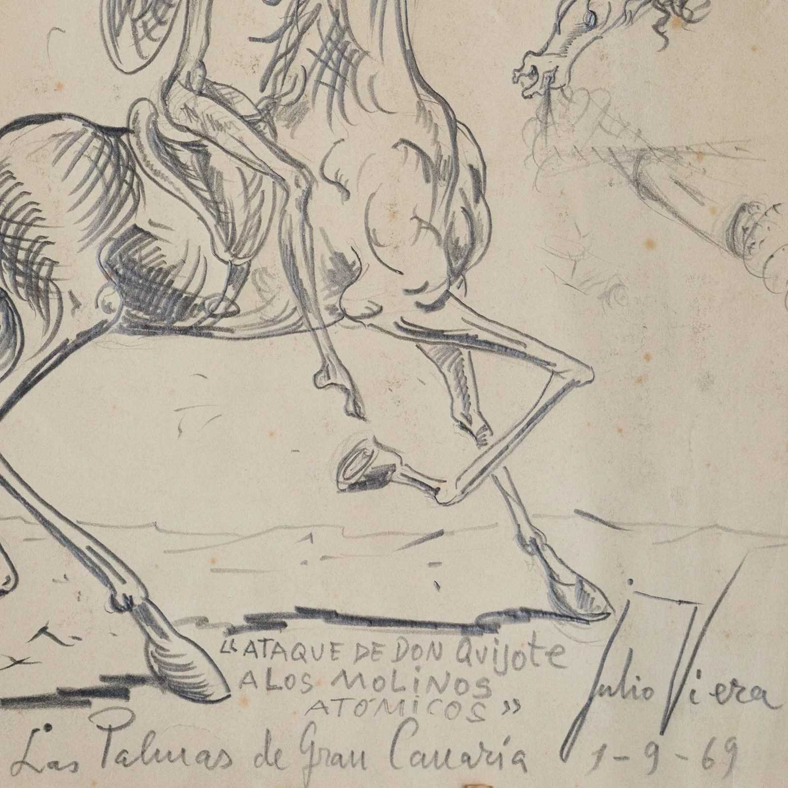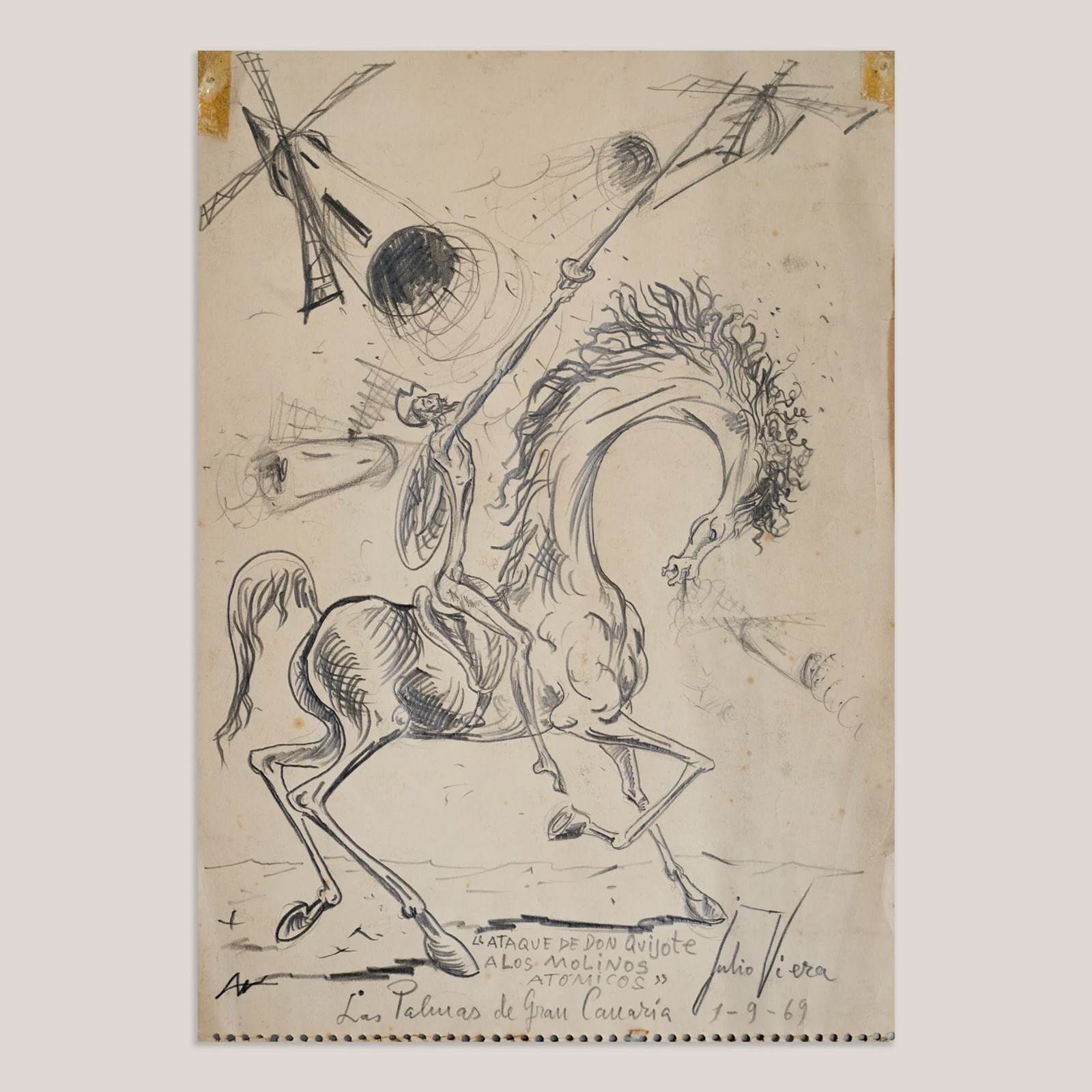 This original pen and ink drawing by Julio Viera presents a dynamic interpretation of Don Quixote mounted on a skeletal horse, charging toward windmill-like mechanical forms in an expressive composition. Executed with energetic, fluid linework, the scene combines figurative distortion with imaginative elements that suggest movement and tension. Inscribed text reads “El ataque de Don Quijote a los molinos atómicos” (The attack of Don Quixote on the atomic mills) and “Las Palmas de Gran Canaria” with the date “1-9-69,” anchoring the work in both place and time within a mid-20th-century expressive drawing tradition.
