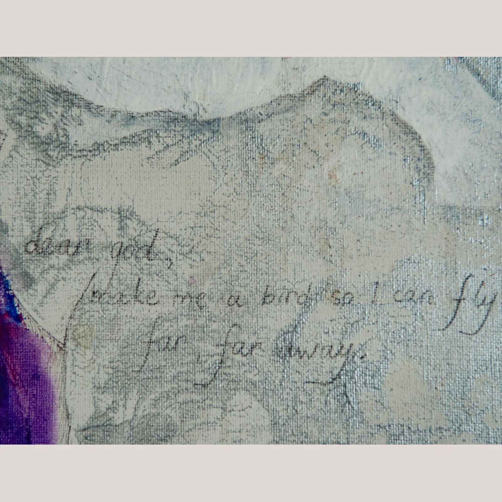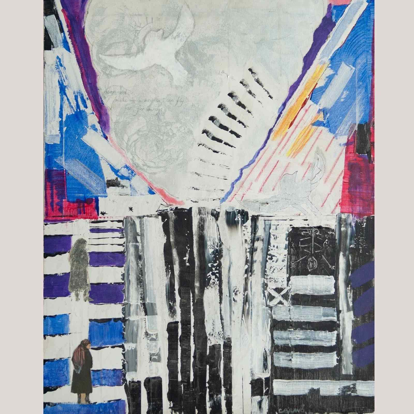 DescriptionThis striking abstract mixed-media painting signed C. Bravo combines bold geometric structure with lyrical emotion. Vertical black and white bars create a sense of rhythm and confinement, while vivid accents of violet, crimson, and blue energize the composition. Above, a faintly drawn bird soars within a pale sky, accompanied by the handwritten phrase, “dear god, make me a bird so I can fly far far away.” The integration of text, texture, and layered pigment evokes longing and transcendence. The artist’s technique reveals a balance between disciplined design and expressive freedom, resulting in a deeply atmospheric composition that bridges abstraction and narrative. Its tactile surface and visual poetry make it a compelling focal point in any refined contemporary setting. ArtistSigned C. Bravo (artist unidentified at present). Artist DetailsThe signature C. Bravo has not yet been attributed to a known artist. The work reflects qualities of late 20th-century European abstraction, characterized by textured surfaces, gestural layering, and psychological depth. MovementsContemporary Abstract Expressionism Artist Influenced byInfluenced by Antoni Tàpies, Jean-Michel Basquiat, and Cy Twombly. NO SURPRISE SHIPPING COSTS - UK & EU: Free Shipping - price includes packing, shipping & import VAT. USA & Canada: £220 Special offer packing and shipping price to your door. NOTE: Any import duty is not included. All other destinations: packing & shipping calculated at checkout. FOR PURCHASE & BETTER VIEWING:CLICK ON View Seller Website button BELOW.