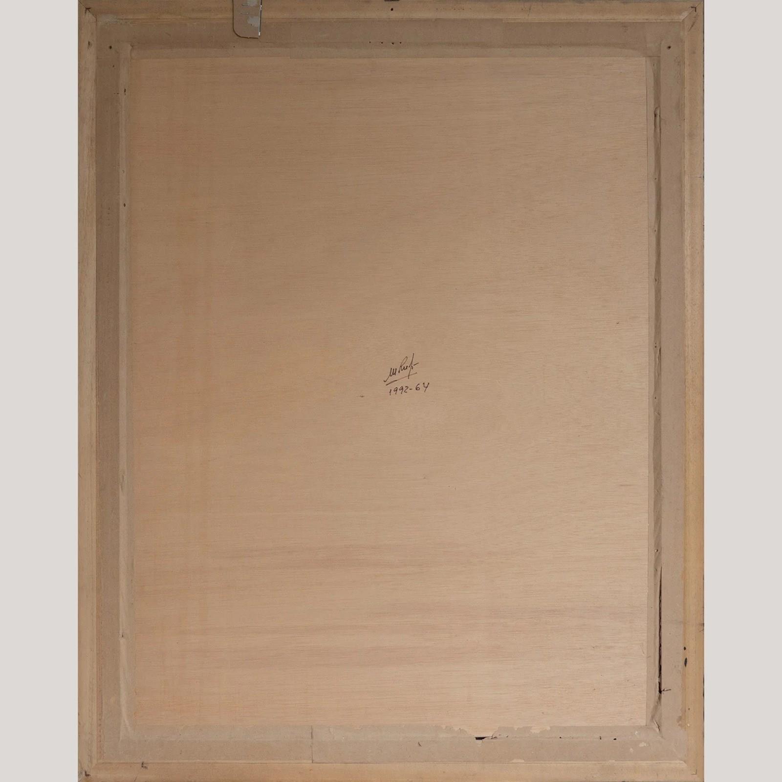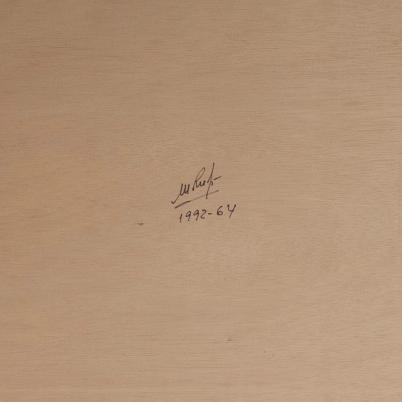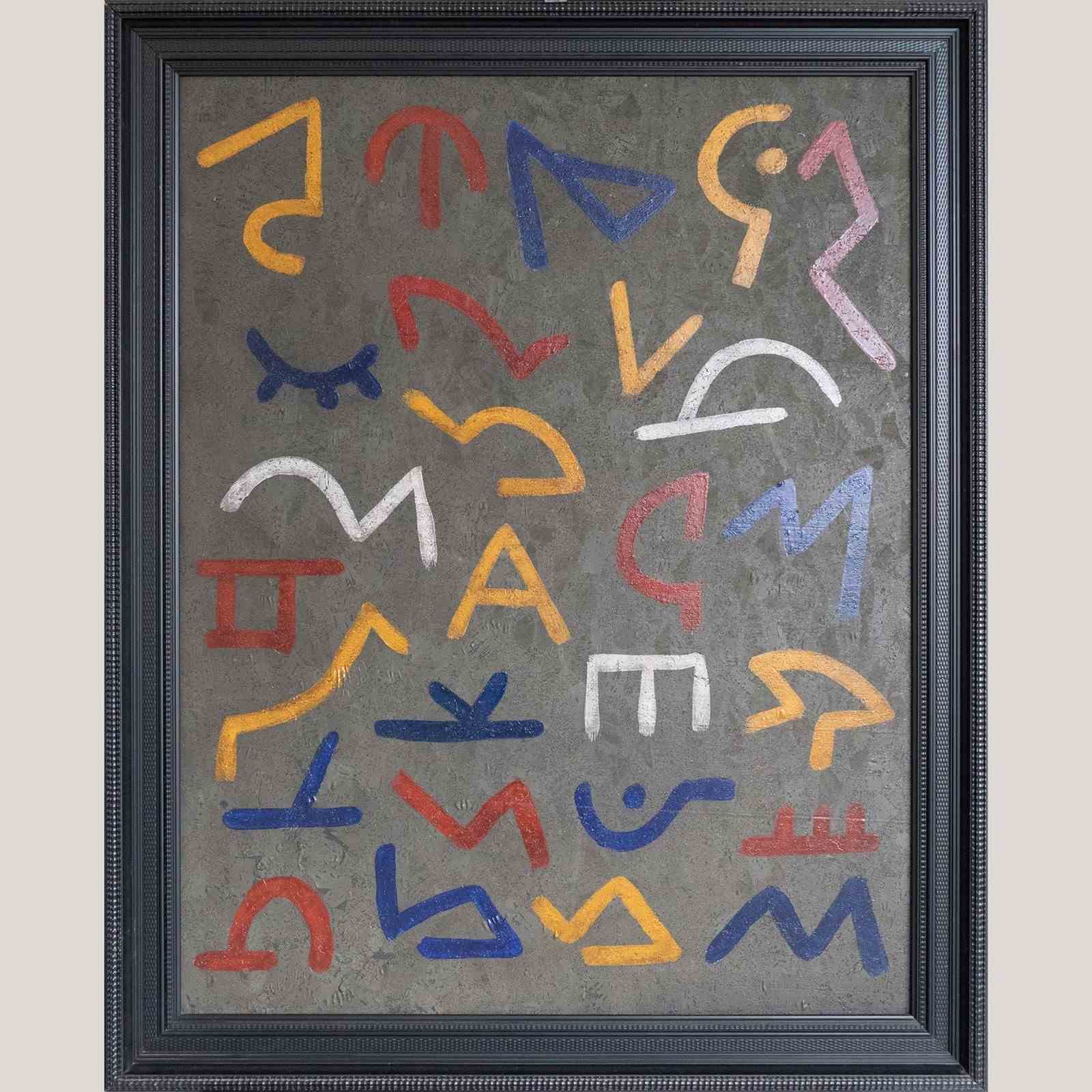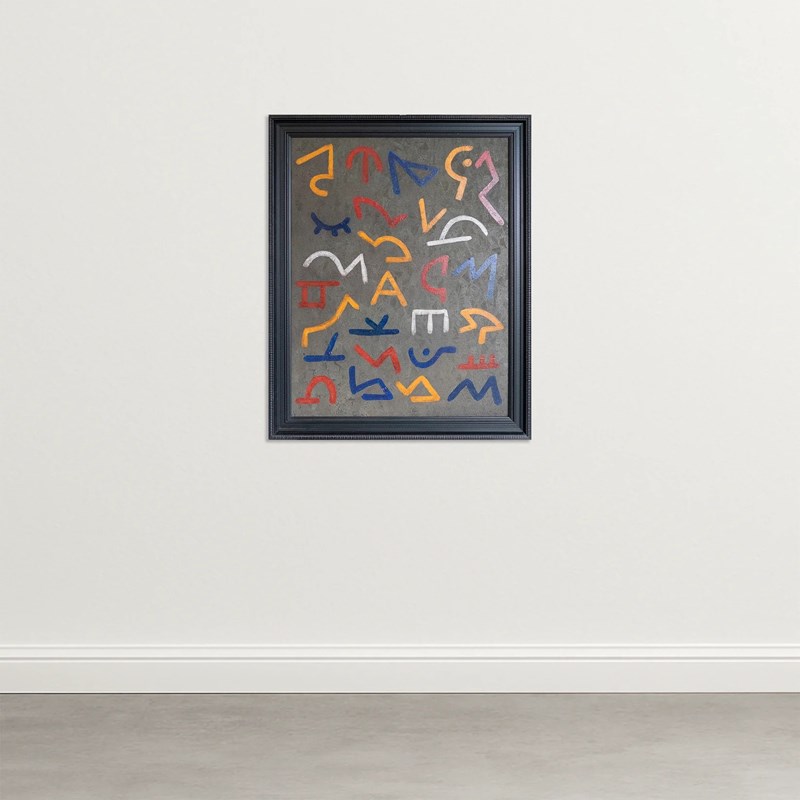 Manuel Rufi Gibert’s oil on board presents a structured geometric abstraction composed of stylised, glyph-like forms arranged across a textured grey ground. Rendered in a controlled palette of cobalt blue, mustard yellow, red, white, and soft pink, the composition balances repetition and variation, creating measured visual rhythm within a flat, architectural space. The simplified, rotated motifs suggest symbolic characters while maintaining a rigorous commitment to formal clarity and chromatic harmony. Rooted in Spanish post-war geometric abstraction, the work reflects a disciplined exploration of structure, colour relationships, and spatial order, offering a confident and graphically striking presence.