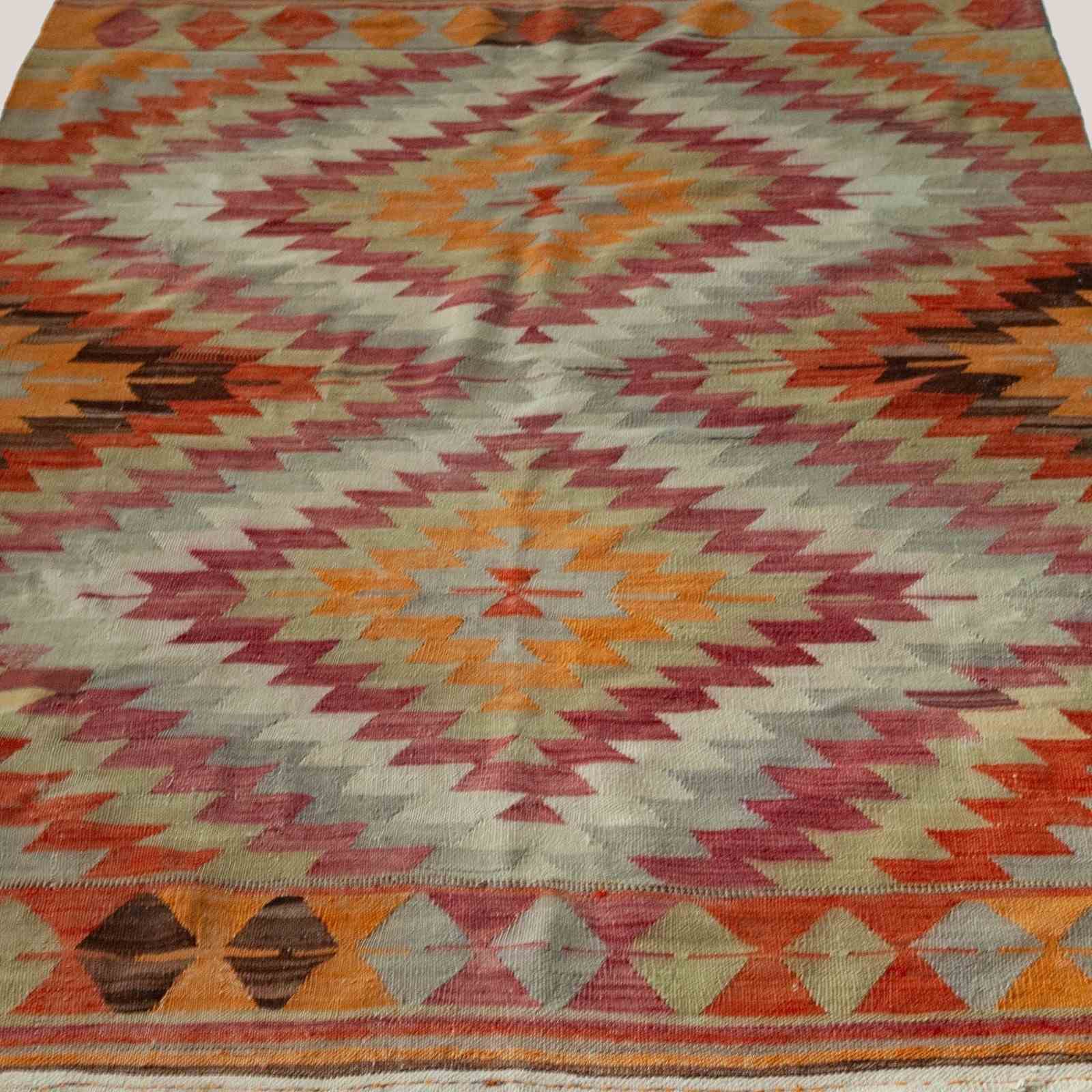 This vintage hand-woven kilim textile features a symmetrical geometric composition built around stacked diamond medallions and stepped zigzag motifs, characteristic of Anatolian flatweave traditions. Executed in wool, the surface displays a restrained yet warm palette of terracotta, muted orange, soft grey, ochre, and faded red tones, achieved through naturally aged dyes.