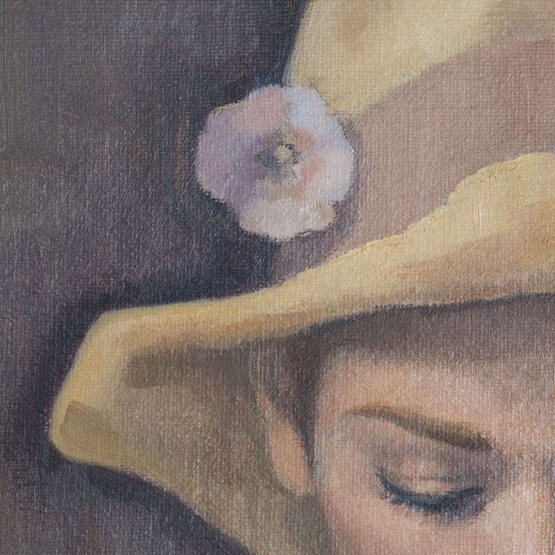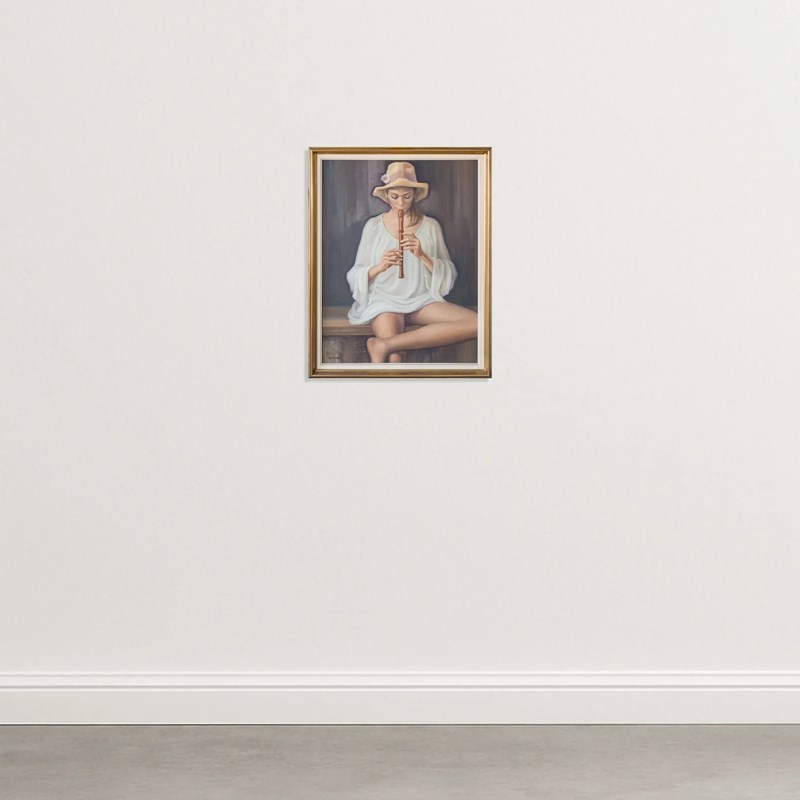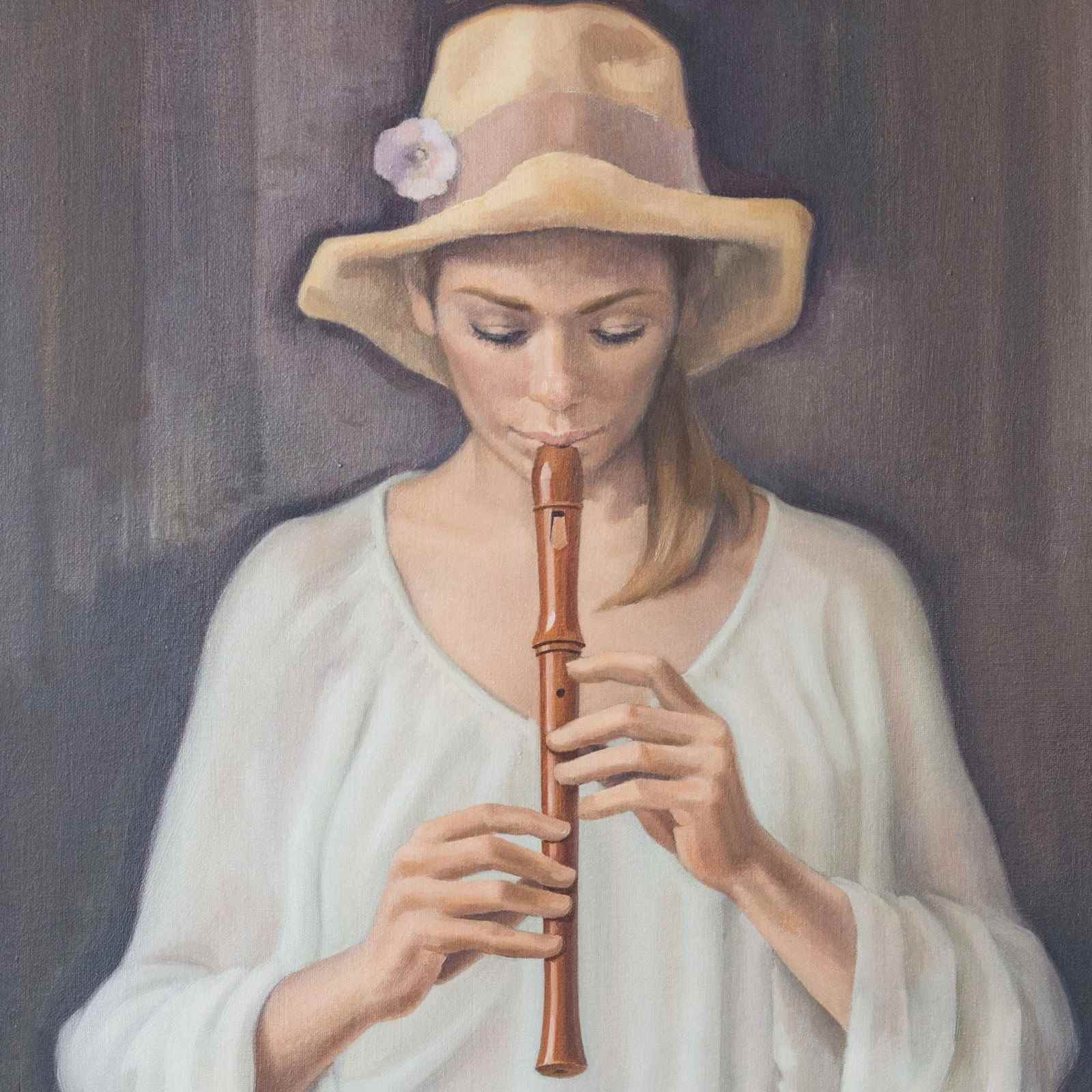 This oil on canvas depicts a young woman seated on a wooden bench, absorbed in playing a recorder. Executed in a muted palette of soft creams, warm flesh tones, and subdued greys, the composition is defined by smooth brushwork, balanced proportions, and controlled lighting that gently models the figure against a dark, understated background. The subject’s downward gaze and relaxed posture create a quiet, introspective mood, while the broad-brimmed hat and flowing white garment lend the scene a timeless, classical character. The work reflects a contemporary figurative realist approach, with careful anatomical rendering and a restrained, harmonious treatment of tone and form.
