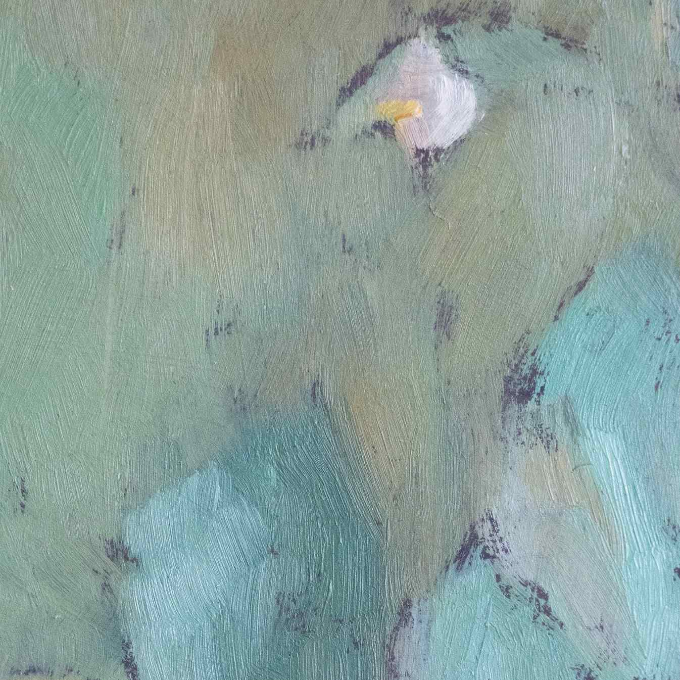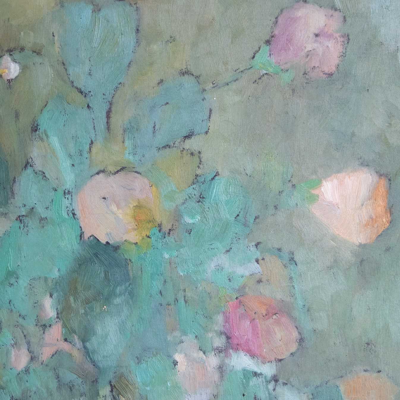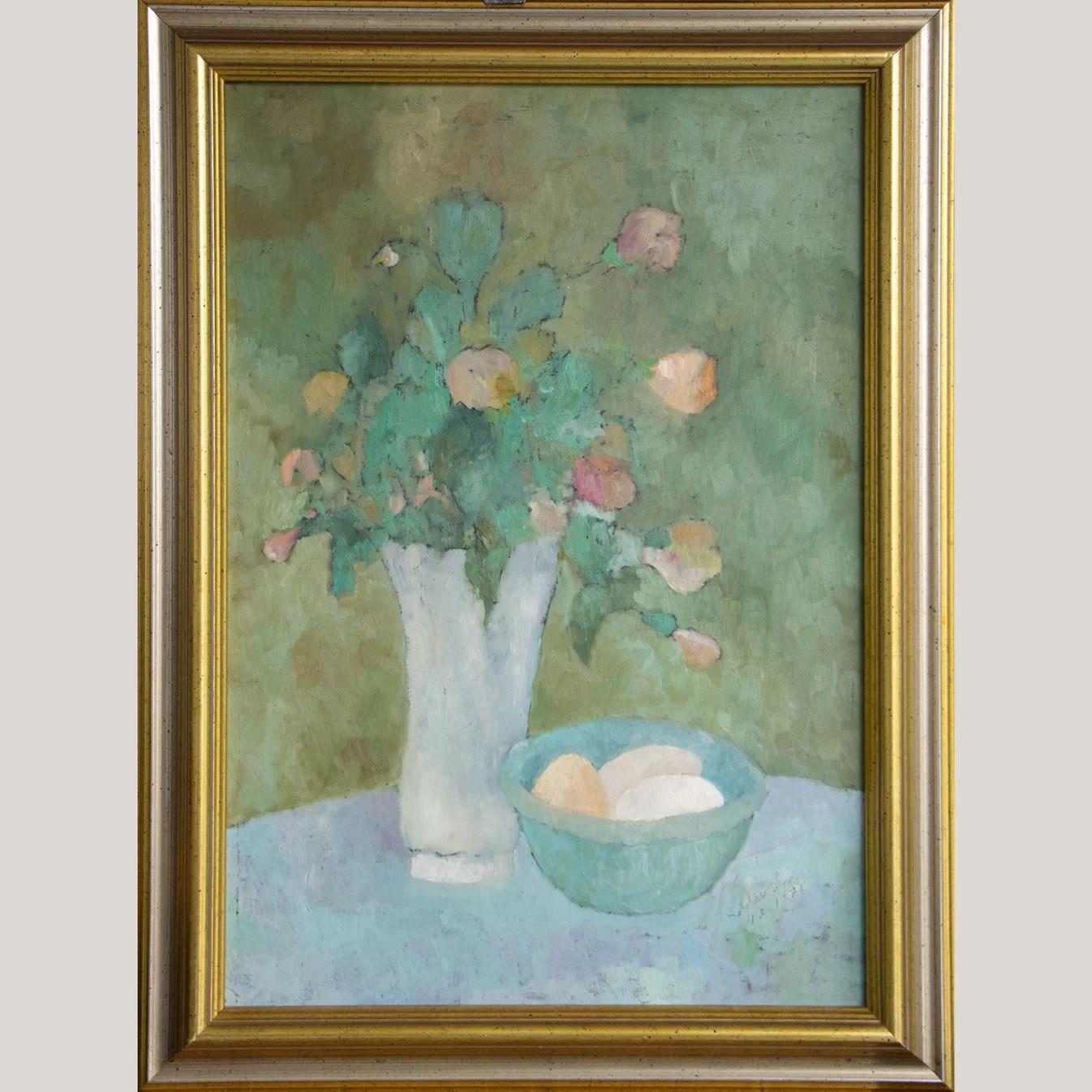 This elegant Impressionist oil on board, painted in 1971, depicts a graceful floral arrangement in a white vase set against a softly blended green background. The composition exudes serenity through its delicate palette of mint greens, rose pinks, and pale lilacs, subtly balanced by the cool tones of the table beneath. Loose yet deliberate brushwork captures the fleeting beauty of light and color, lending the scene a poetic, dreamlike quality. The artist’s technique evokes the quiet lyricism of mid-20th-century European still life painting, where atmosphere and tonal balance take precedence over detail. The result is a refined and contemplative work that brings warmth, elegance, and understated sophistication to any interior.