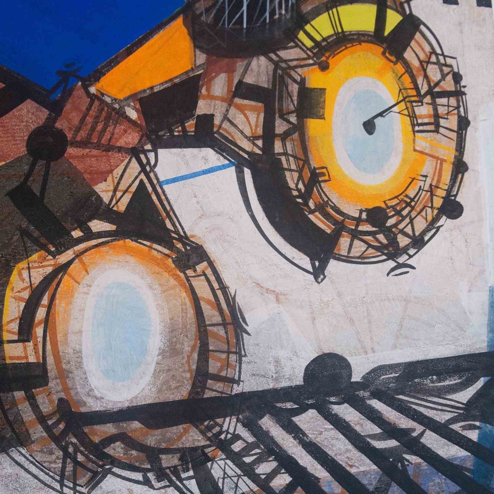 Presented in a striking vertical format and likely executed in mixed media—oil or acrylic with graphite or ink—on canvas, this work belongs to the realm of geometric abstraction with a distinctly mechanical character. Its dynamic composition centers on two circular forms reminiscent of gears or turbines, linked by intricate black lines evoking scaffolding and cables. The color palette contrasts deep cobalt blue with ochre, rust, and yellow tones, suggesting metal and machinery against an industrial sky. Energetic brushwork and layered transparencies create a texture of controlled complexity, blending structure with expressive motion. The result is a compelling vision of an industrial machine, at once monumental and poetic, embodying the spirit of 20th-century modernity and progress.