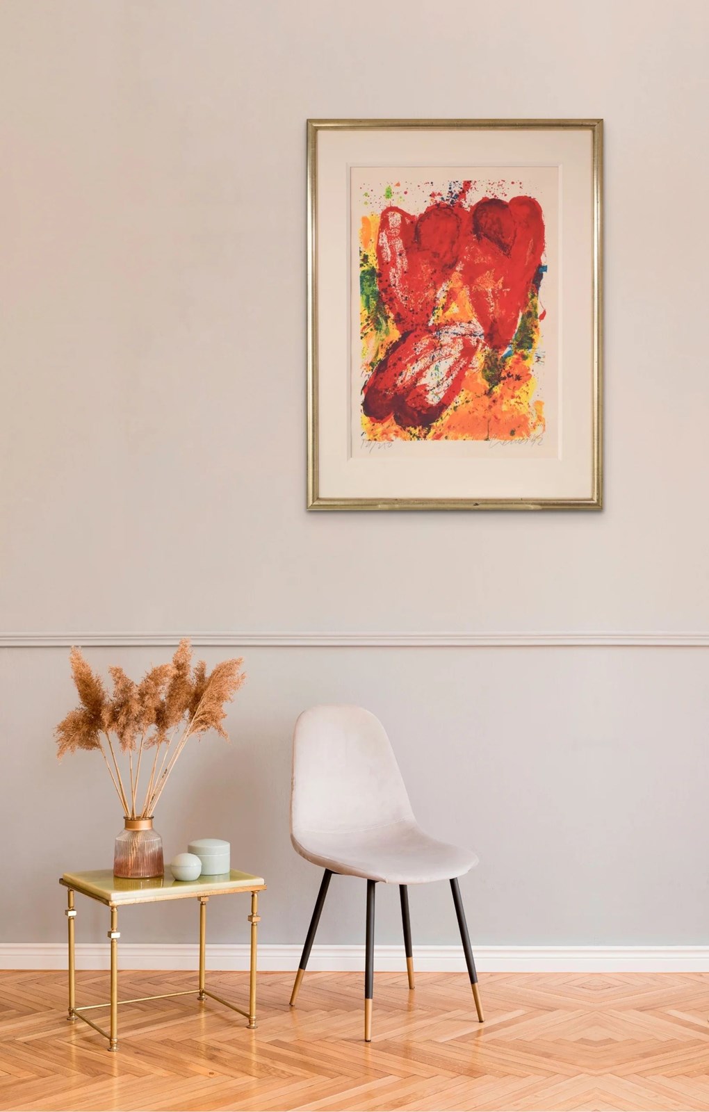 Titled 'Three Tulips Nr.II' by the artist, this explosive piece uses dynamic brush strokes and splattered paint to express volatility and passion, creating this limited edition silkscreen. The tulip is a symbol for deep, unconditional love, and Cremer ingeniously draws intensity and emotion from these delicate flowers.