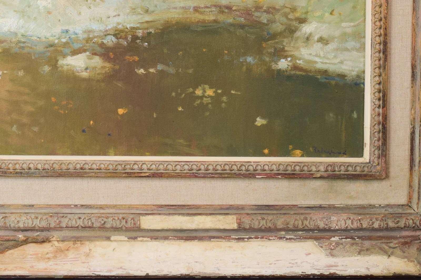 Palau Junca's delicate Impressionist style has a delightfully nostalgic feel. Using subdued tones and soft brush strokes, the artist creates a gentle haze over the painting, invoking a fond, distant memory of this idyllic setting of chalets on the water.