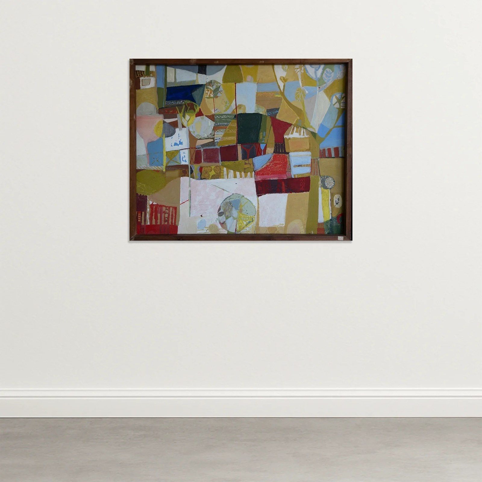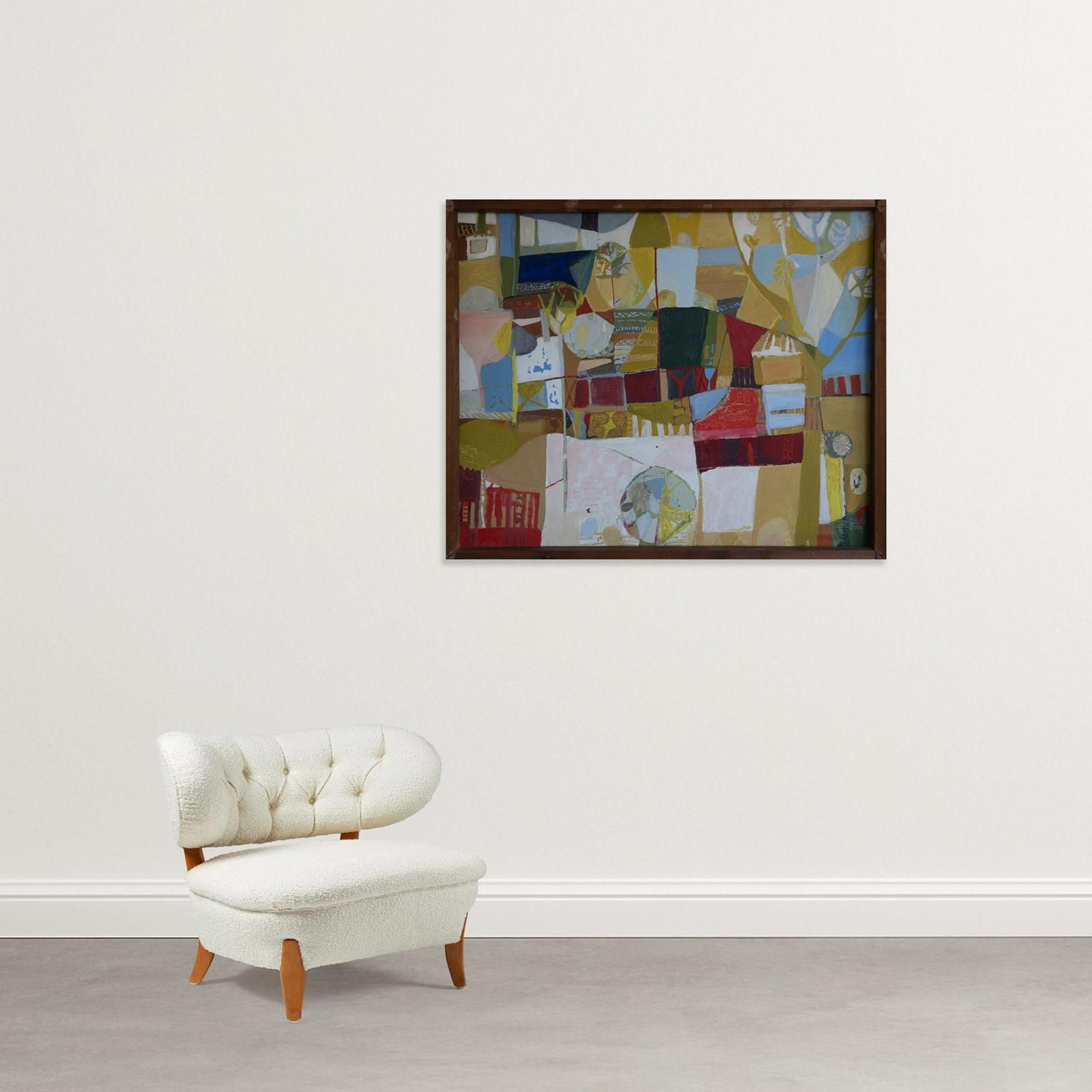 This striking large mid-century abstract composition is a masterful exploration of color, form, and rhythm. The artist constructs the surface through interlocking geometric planes in ochre, crimson, moss green, pale blue, and cream, creating a visual patchwork that evokes both landscape and architecture. The use of layered impasto and visible brushstrokes lends the work a rich, tactile quality, while the careful balance of warm and cool tones generates a sense of movement and harmony. The composition’s rhythm and structure align it with the aesthetic principles of European geometric abstraction, yet it retains a human warmth and painterly spontaneity that distinguish it from purely formal modernism. The result is a vibrant and sophisticated work that merges order with emotion, making it an outstanding piece of mid-century modern art suitable for elegant, contemporary environments.