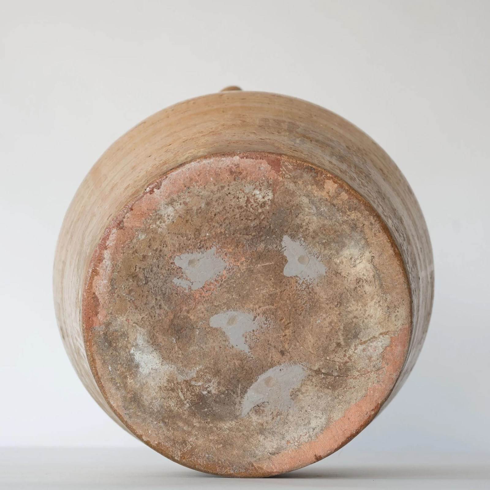 This extra large 19th-century terracotta olive pot, likely from Spain or southern France, was traditionally used for storing olive oil and produce. Hand-thrown with a rounded body, tapering base, applied loop handles, and a thickened rim, it reflects practical rural craftsmanship. The surface shows natural variations in ochre and sienna with visible throwing lines and kiln marks. Age-related patina and wear consistent with use enhance its authenticity and historic character.