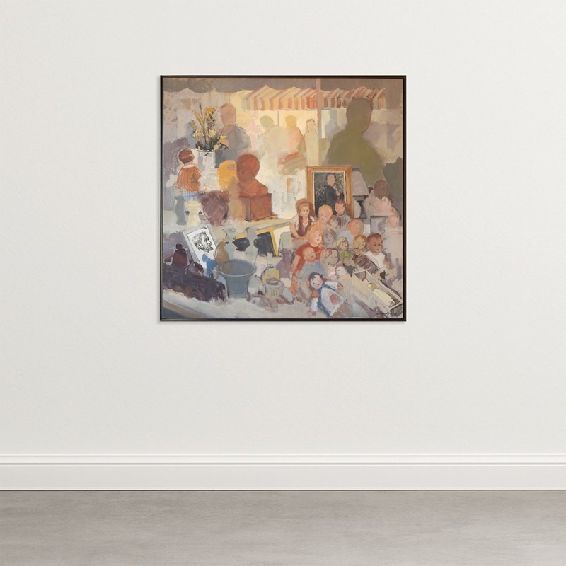With influences from the work of Scottish artist Joan Eardley, this fantastic piece truly captures the medley and miscellany of the antique market. The chaos of the composition allows you notice something new every time you glance at this painting, whilst the large scale absorbs the viewer within the scene, cleverly evoking the feeling of getting lost amongst the crowds.