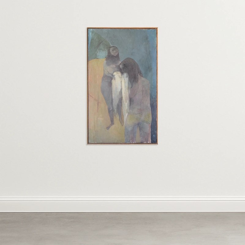 https://www.decorativecollective.com/dealers/modern-decorativeA captivatingly enigmatic piece that strongly echoes the unique Neo-Romanticism of Keith Vaughan (1912-1977). Highly unique and distinctive in its style, this painting depicts two nude female figures holding draped white cloths, which come together to create a form that resembles angel wings, creating a thought-provoking focal point for the composition. The hazy, pastel colours and indistinct forms create an overall dreamlike and ethereal tone for this fascinating piece.