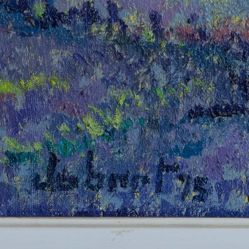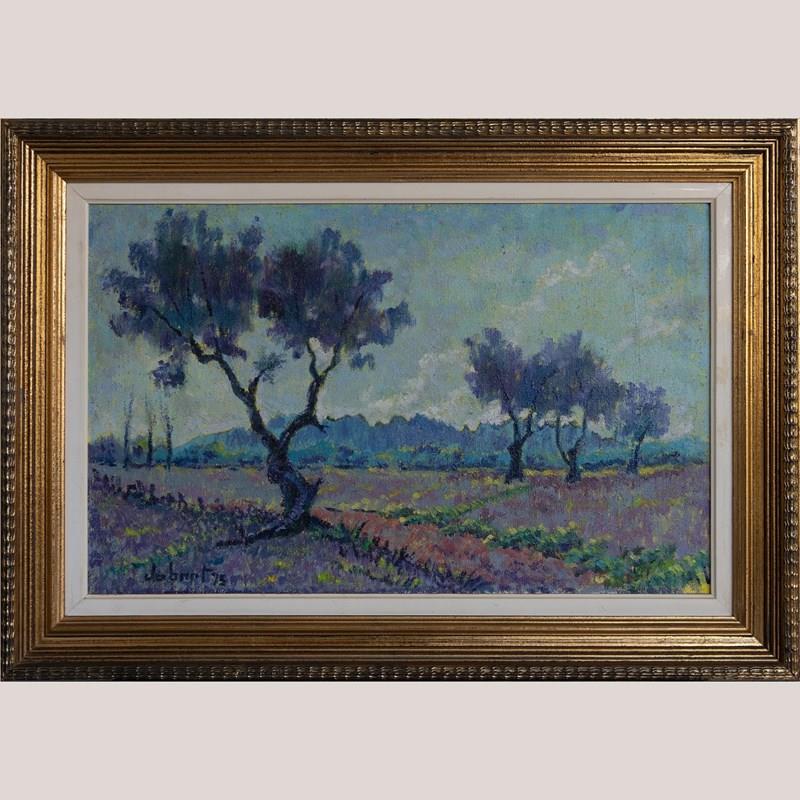 Joan Jubert Segon’s Primavera (1975) captures the luminous serenity of the Catalan countryside near Manresa. The composition unfolds with olive trees standing over violet and green fields beneath a radiant sky, their twisting trunks rendered with expressive vitality. Through textured brushwork and a refined sense of color, Jubert conveys the shimmering air and chromatic harmony of spring in full bloom. The painting presents a lyrical composition of lavender fields and olive trees under a luminous Mediterranean sky, where soft mountain silhouettes form the tranquil horizon. The focus is not on precise detail but on atmosphere—the flicker of Mediterranean light and the poetic rhythm of the landscape. Subtle blues, lavenders, and greens create an impression of freshness and lyrical calm, evoking both the region’s natural beauty and the artist’s emotional connection to it. The work’s balance and luminosity place it firmly within the Catalan Impressionist tradition, blending painterly freedom with a profound sense of place and season.