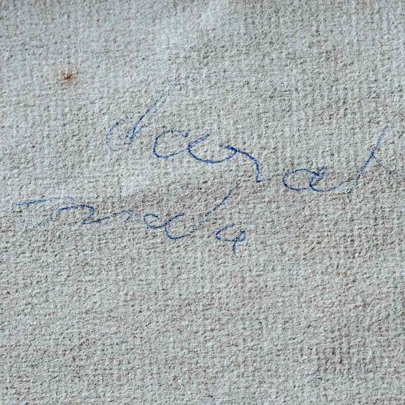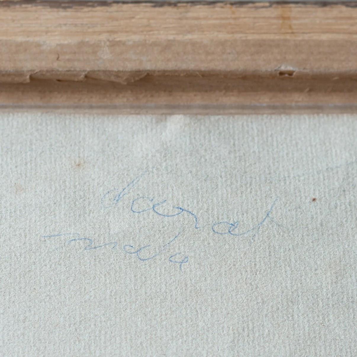 The reverse of the drawing, when illuminated, reveals several significant paper marks. The watermark “INGRES” is clearly legible, identifying Ingres drawing paper, a high-quality surface widely used by professional artists from the late 19th century onward. The vertically oriented watermark “J WHATMAN” refers to James Whatman, the renowned English papermaker whose papers were commonly employed in academic and professional contexts during the 19th and early 20th centuries. An oval stamp bearing the initials “A I” is also visible and is likely a paper mill or distributor’s mark associated with Ingres-type paper rather than an artist’s signature. A blue pencil cursive inscription appears on the reverse but is not fully legible; it does not resolve into an identifiable artist’s name and is consistent with studio notes, ownership marks, or an academic reference.