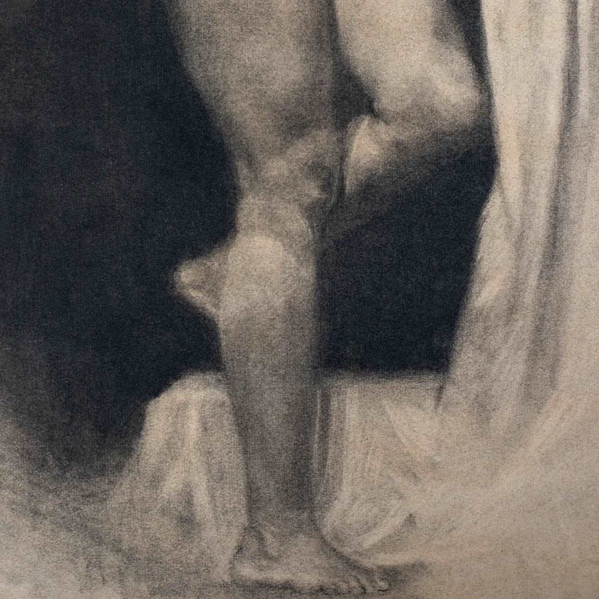 This high-quality charcoal drawing depicts a male nude leaning contemplatively against a draped pedestal, executed with refined tonal control and academic precision. The artist employs subtle gradations of light and shadow to articulate musculature and skeletal structure, allowing the figure to emerge with sculptural clarity from a dark, atmospheric ground. The restrained monochrome palette and softly blended surfaces emphasize volume, balance, and anatomical accuracy rather than expressive gesture. The carefully observed pose and compositional restraint align closely with late 19th- to early 20th-century academic studio practice, where disciplined life drawing formed the foundation of formal artistic training. The calm, introspective mood and controlled chiaroscuro suggest a pedagogical intent rooted in classical ideals. Overall, the work demonstrates accomplished draftsmanship and a sophisticated understanding of form consistent with professional academic instruction.