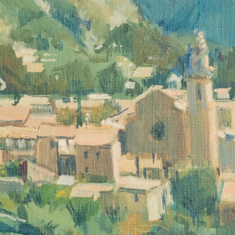 Oscar Falguera depicts a mountain village landscape in oil on canvas, showing a compact group of buildings centered around a church within rolling terrain. The composition uses simplified architectural forms and layered hills to create depth, with distant blue mountains defining the horizon. The palette consists mainly of greens, pale stone tones, ochres, and muted blues, contributing to a balanced and coherent spatial structure. Brushwork is broad and controlled, prioritizing clarity of form over detail. Even lighting across the surface supports a stable, calm visual effect. The work reflects mid-20th-century European landscape painting, combining post-impressionist structure with a modern regional approach.
