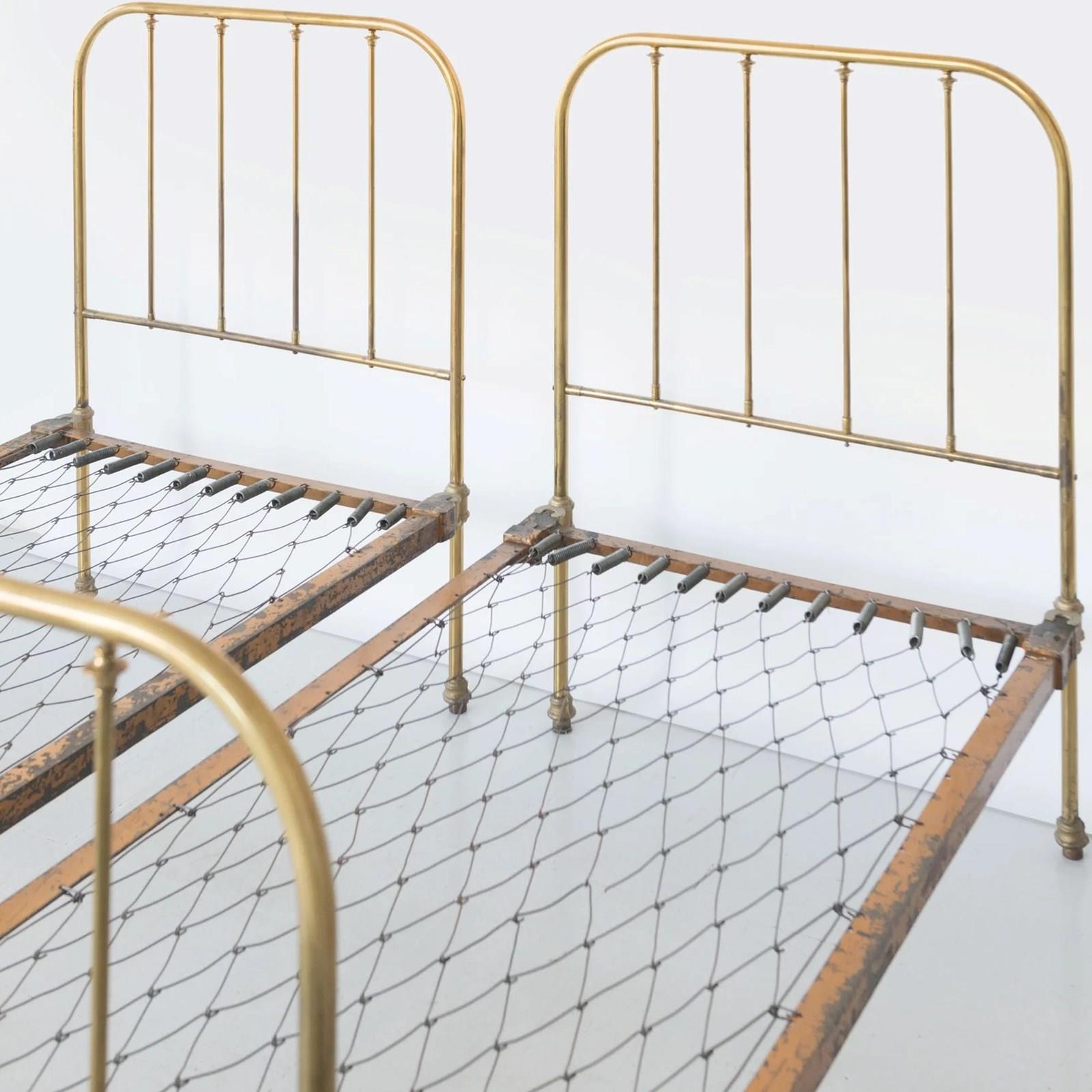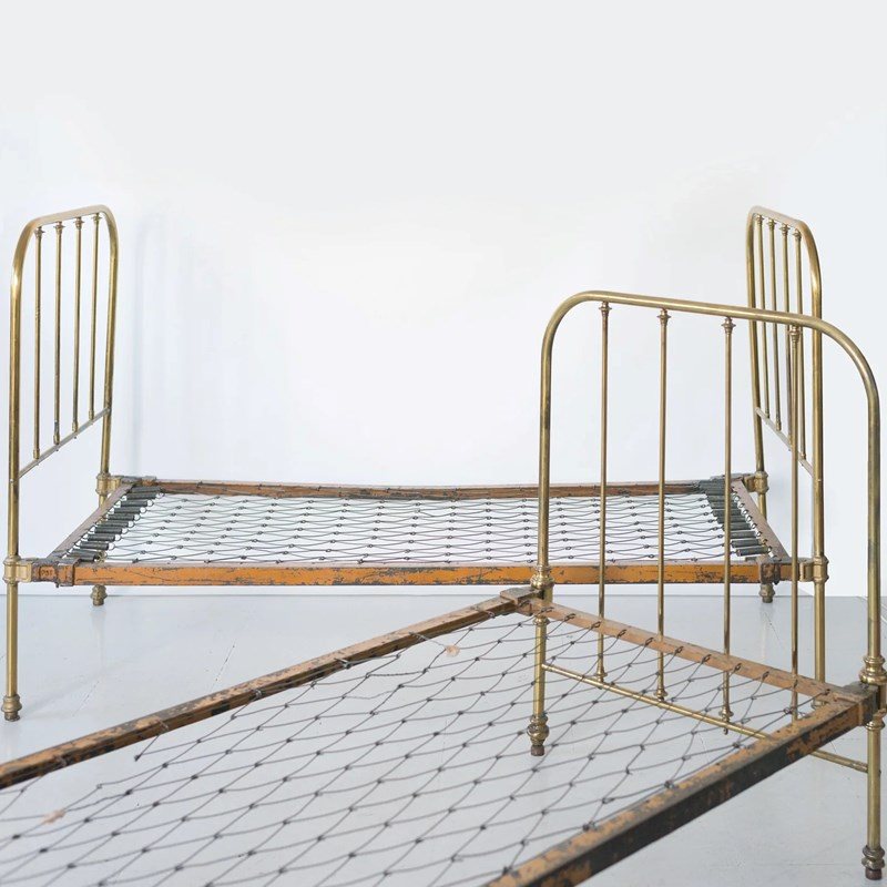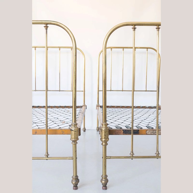 This pair of antique solid brass twin beds exemplifies late 19th to early 20th century craftsmanship, defined by elegant vertical spindle rails, rounded head and footboards, and a warm, naturally aged patina. Each bed measures H: 120 cm, W: 89 cm, L: 188 cm, offering well-proportioned single dimensions suited to both traditional and eclectic interiors. The tubular brass frames are finely balanced with turned detailing and symmetrical structure, reflecting Victorian and Edwardian design influences. Original spring bases remain intact, featuring coiled supports and painted metal frames bearing period trade labels referencing the “Varnoid Process.” The mellow golden tone of the brass contrasts with the utilitarian character of the exposed springs, creating visual depth and authenticity. Light age-related wear and surface marks are consistent with use and enhance the historical integrity of this increasingly rare matching pair.
