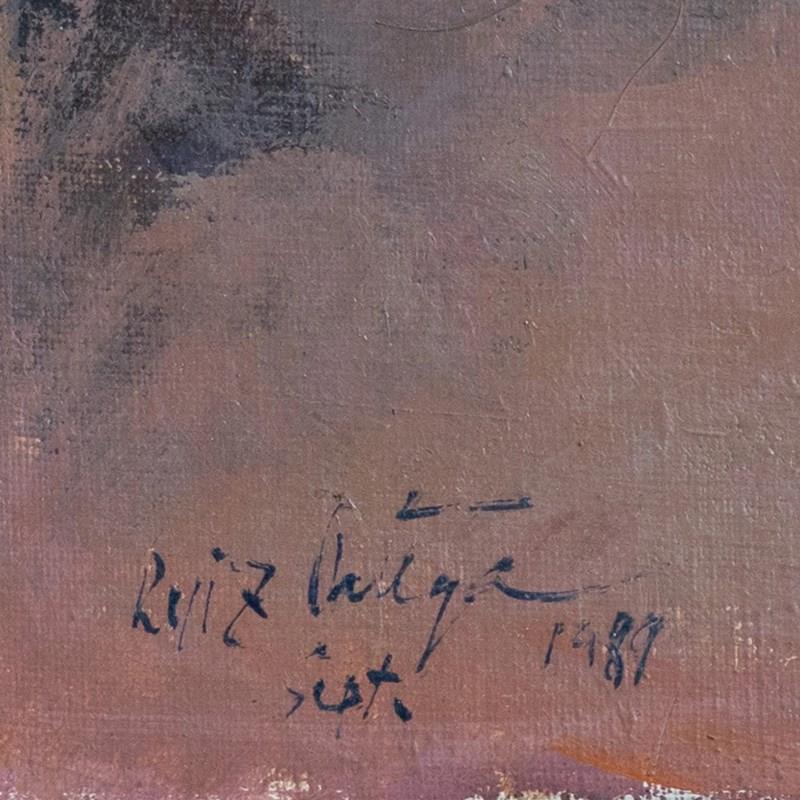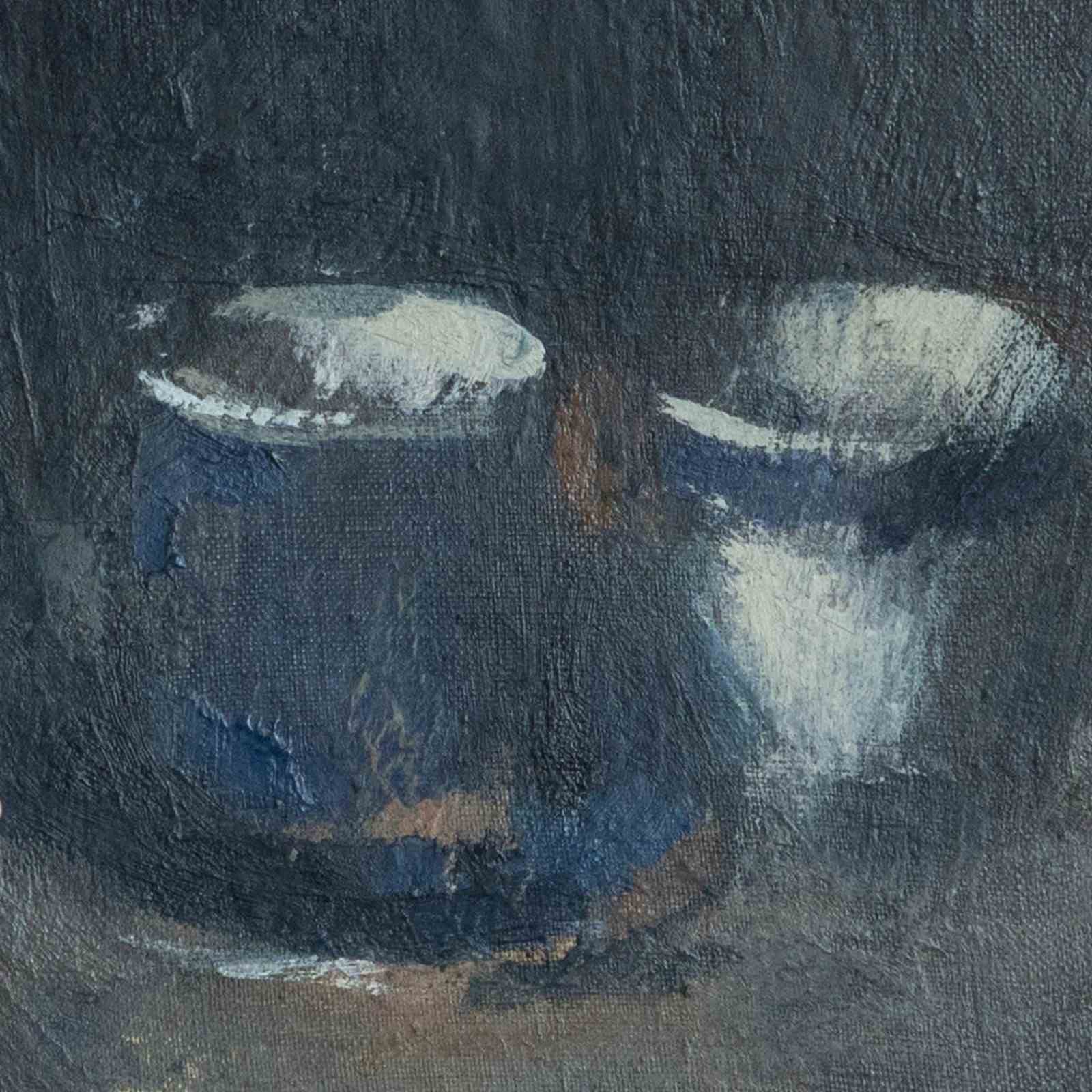 This harmonious pair of still life paintings, both signed and dated 1989, capture the poetic quietude of everyday objects rendered with atmospheric subtlety. Each composition focuses on ceramic vessels and cups arranged against soft, painterly backgrounds. The artist’s brushwork is confident yet restrained, emphasizing tonal depth and the interplay between shadow and light rather than sharp detail. One painting presents a luminous palette of teal, cream, and muted rose tones, while the other explores a darker, moody harmony of blue and grey. Together, they form a balanced dialogue between light and introspection. The surface textures reveal the artist’s sensitivity to form and matter, evoking the contemplative stillness reminiscent of mid-20th-century Spanish realism and tonal modernism. Elegant and timeless, the pair radiates calm sophistication suited to refined interiors.