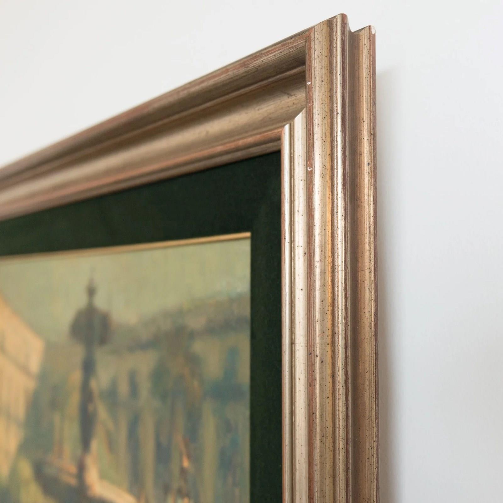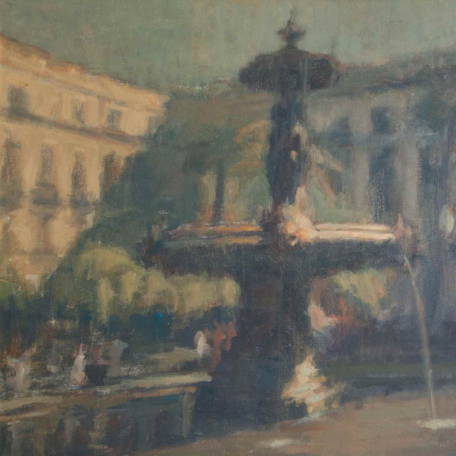 This impressionist oil on canvas depicts Plaça Reial in Barcelona, focused on the central fountain and the surrounding arcaded façades. The scene is constructed with loose, confident brushwork that emphasizes light, tonal balance, and overall atmosphere rather than architectural precision. A restrained palette of muted greens, warm ochres, grey-blues, and soft earth tones creates depth and visual cohesion across the composition. Light is evenly diffused, with subtle reflections in the fountain anchoring the foreground. Figures are lightly indicated to provide scale and a sense of everyday urban activity without narrative emphasis. The painterly surface and softened forms align the work with mid-20th-century European impressionist-influenced cityscapes, where mood, place, and visual rhythm take precedence over detailed description.