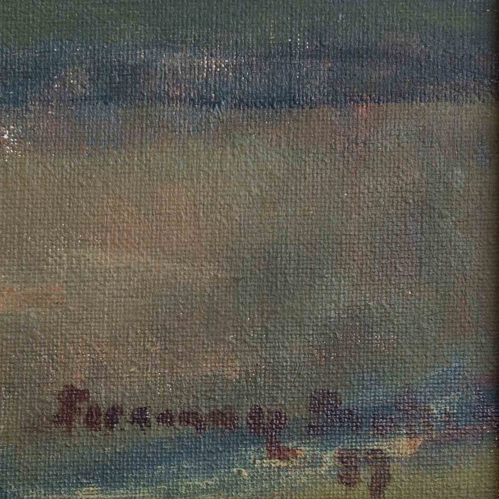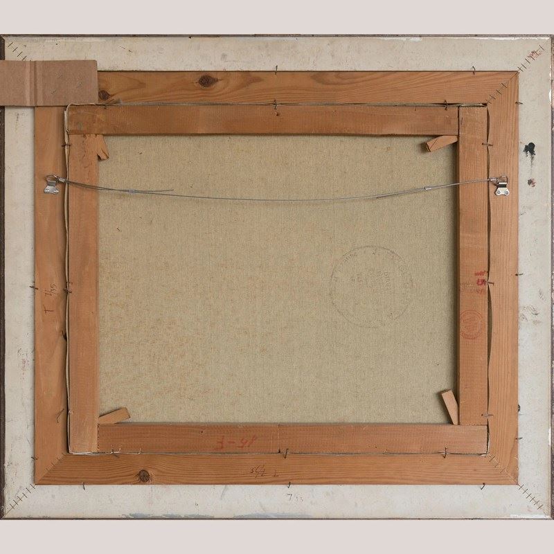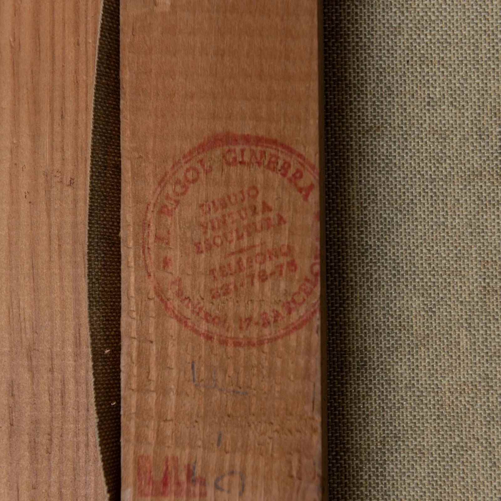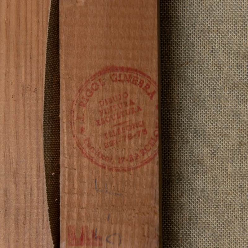 The work reflects the hand of a European-trained painter working in a modern figurative idiom, focused on urban subjects and tonal harmony. A stamp on the reverse indicates restoration or handling by Josep Clara, painter and restorer based in Barcelona, and does not denote authorship.