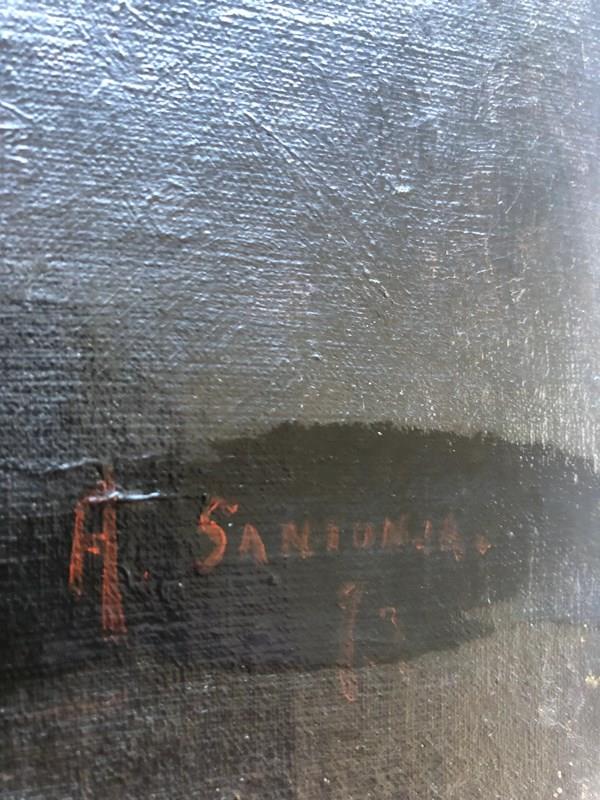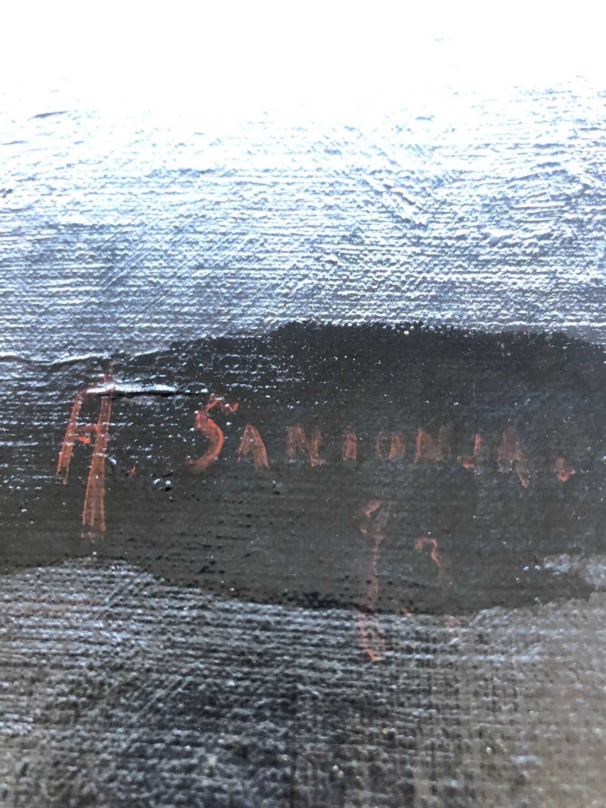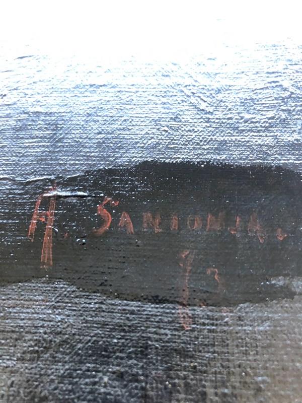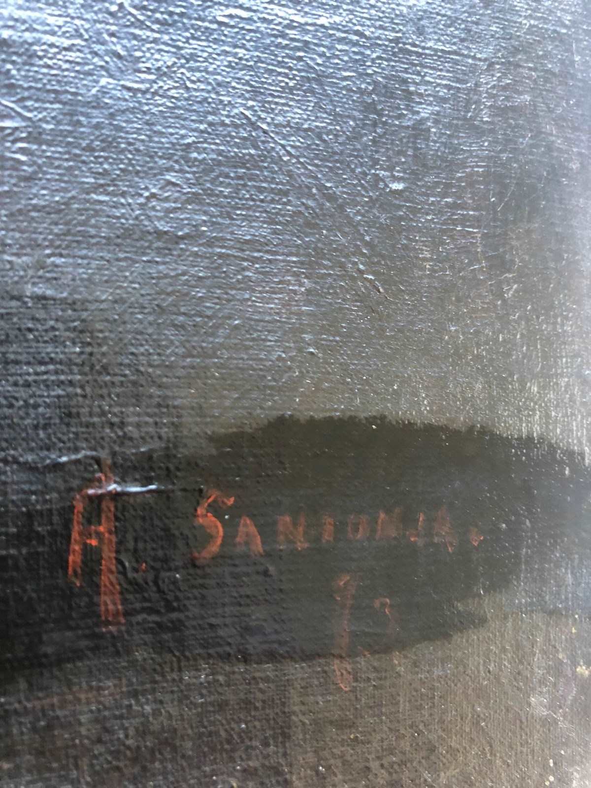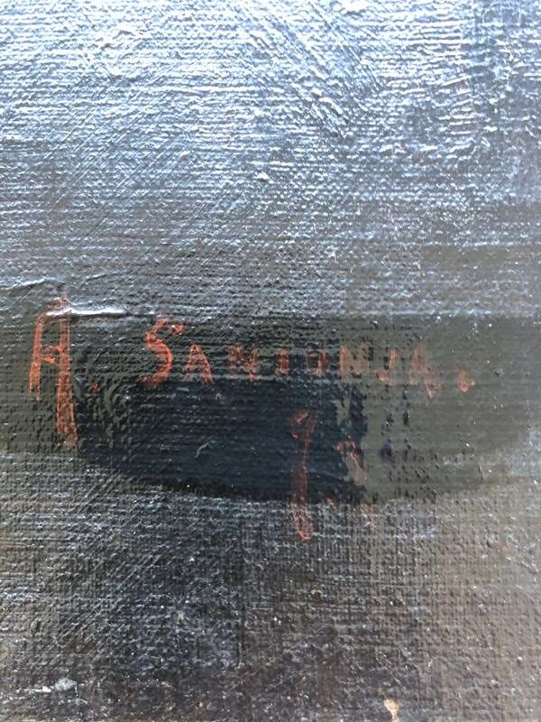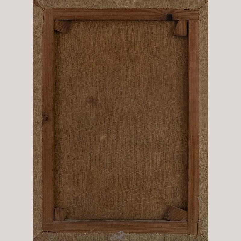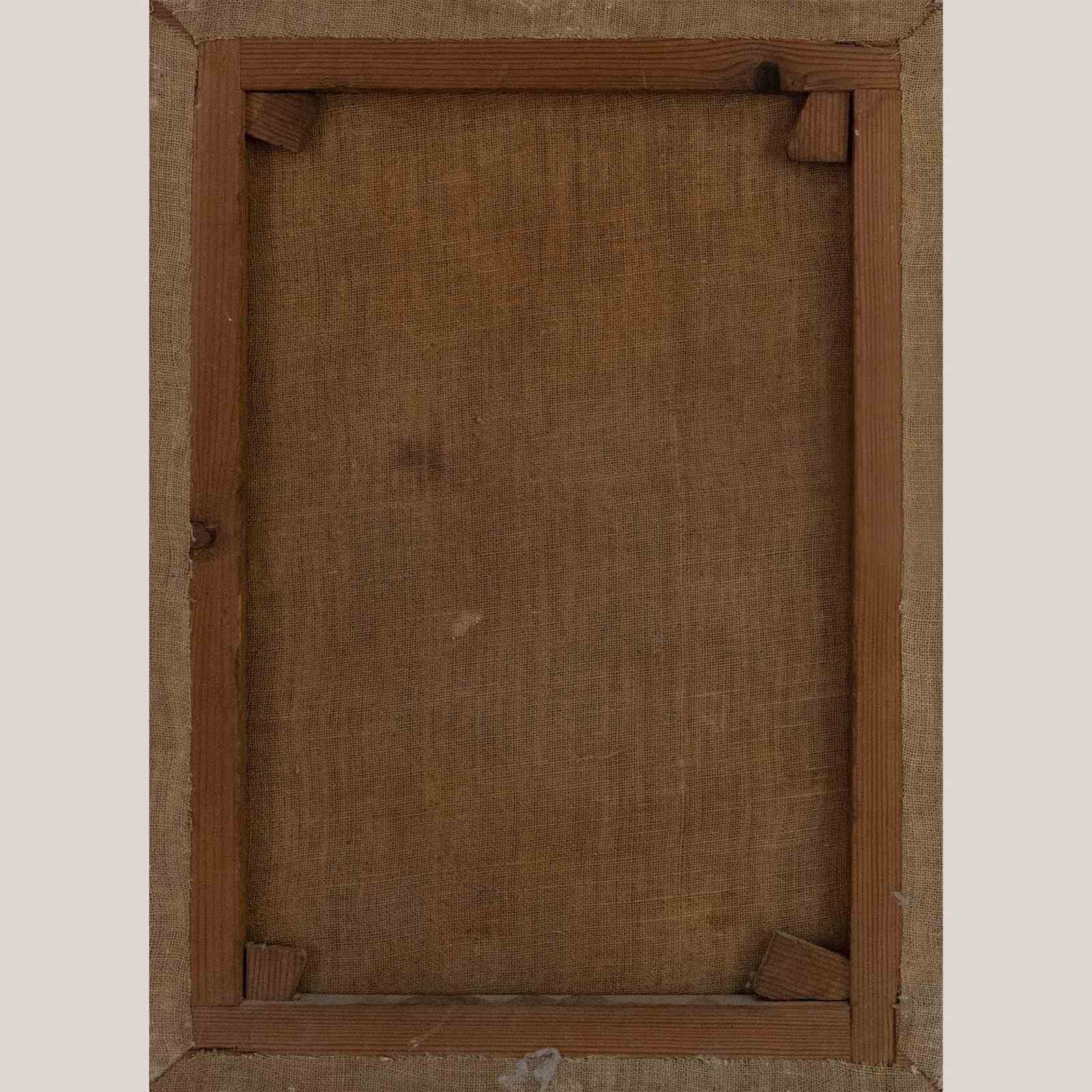 Currently unframed; canvas and stretcher show signs of age but remain structurally sound.