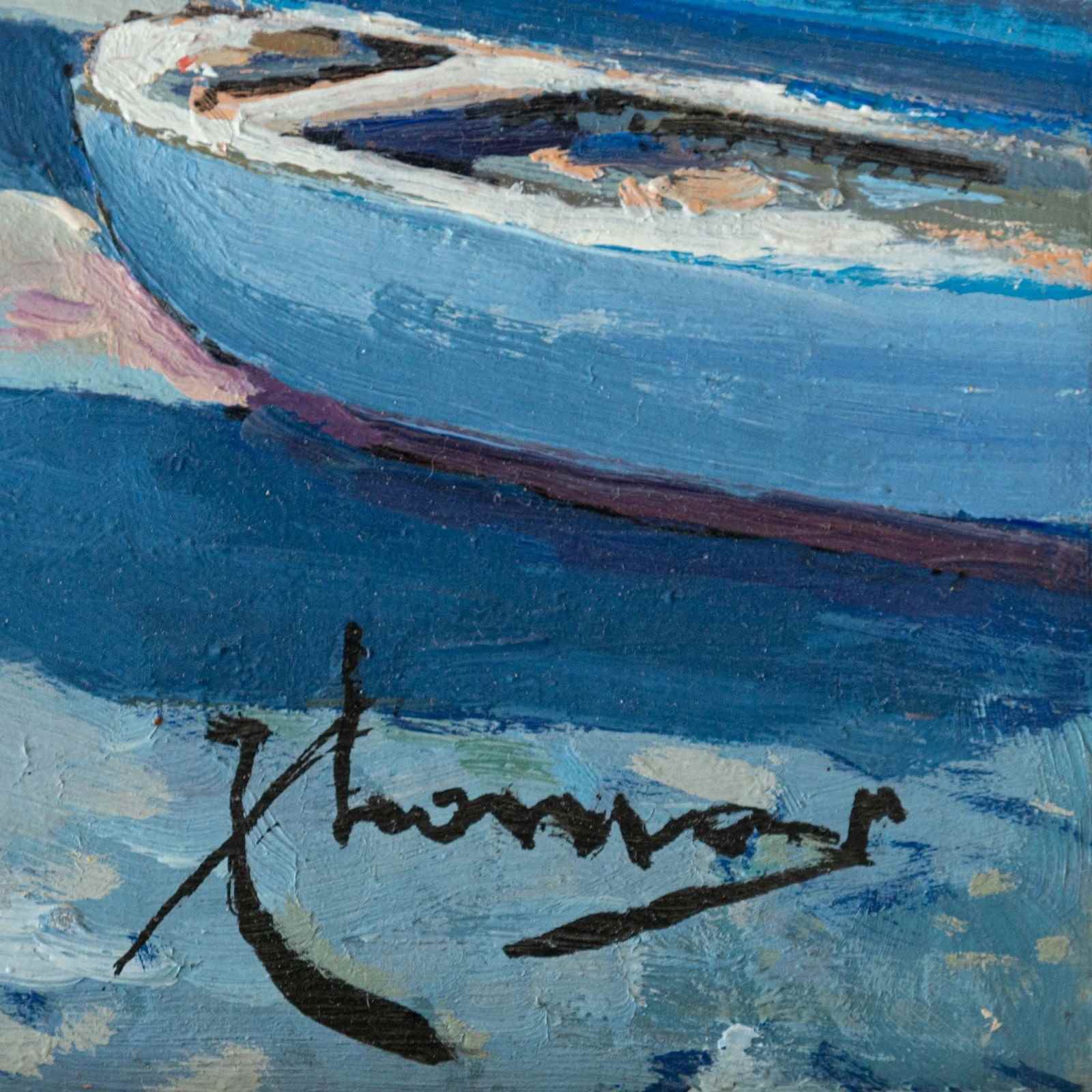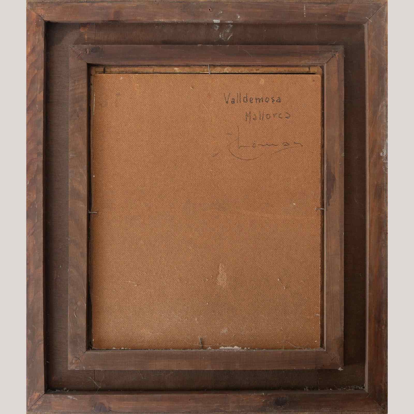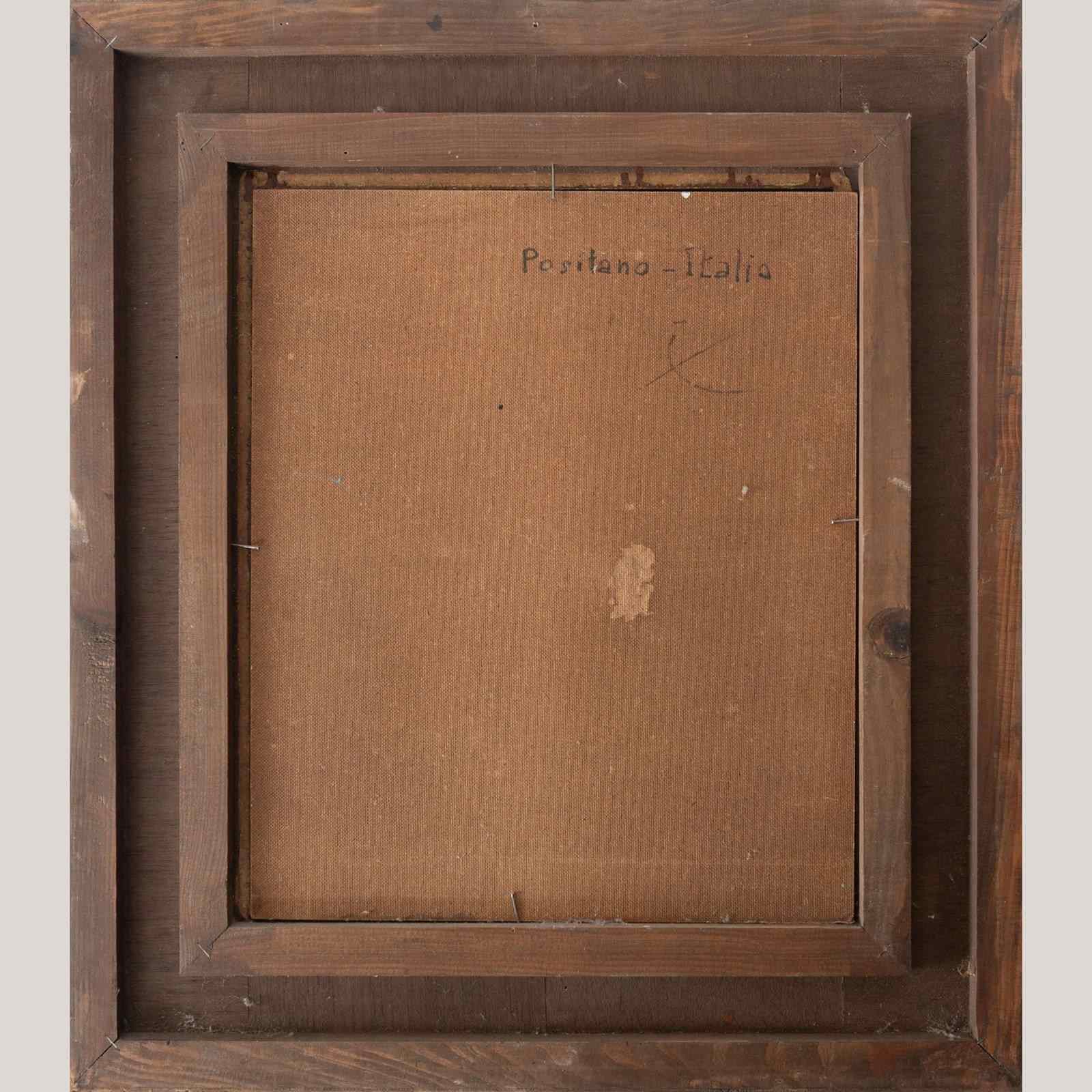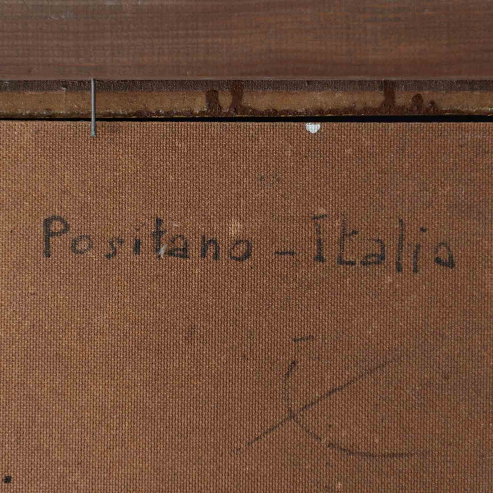 This matched pair of oil paintings depicts two European locations rendered in a consistent, impressionist-influenced style. One painting shows a Mediterranean architectural and harbor scene identified on the reverse as Positano, Italia, featuring clustered buildings, boats, and coastal light. The companion work depicts a garden and monastery view inscribed Valldemossa, Mallorca, framed by trees and formal landscaping. Both works are painted with loose, confident brushwork and a bright palette of blues, whites, and greens, with architectural forms defined through light and shadow rather than detail. Each painting is signed on the front, though the artist has not been securely identified. .