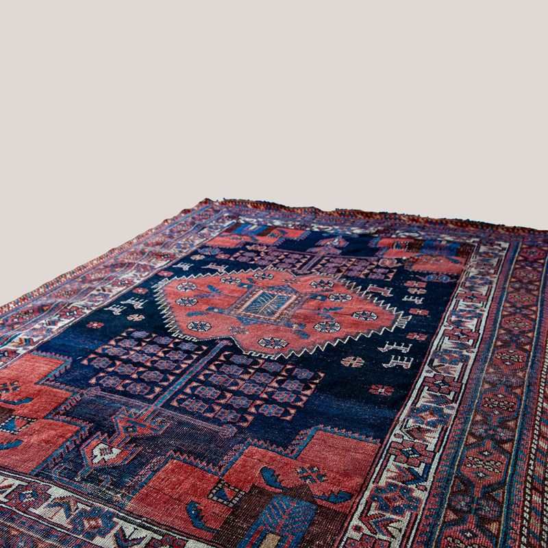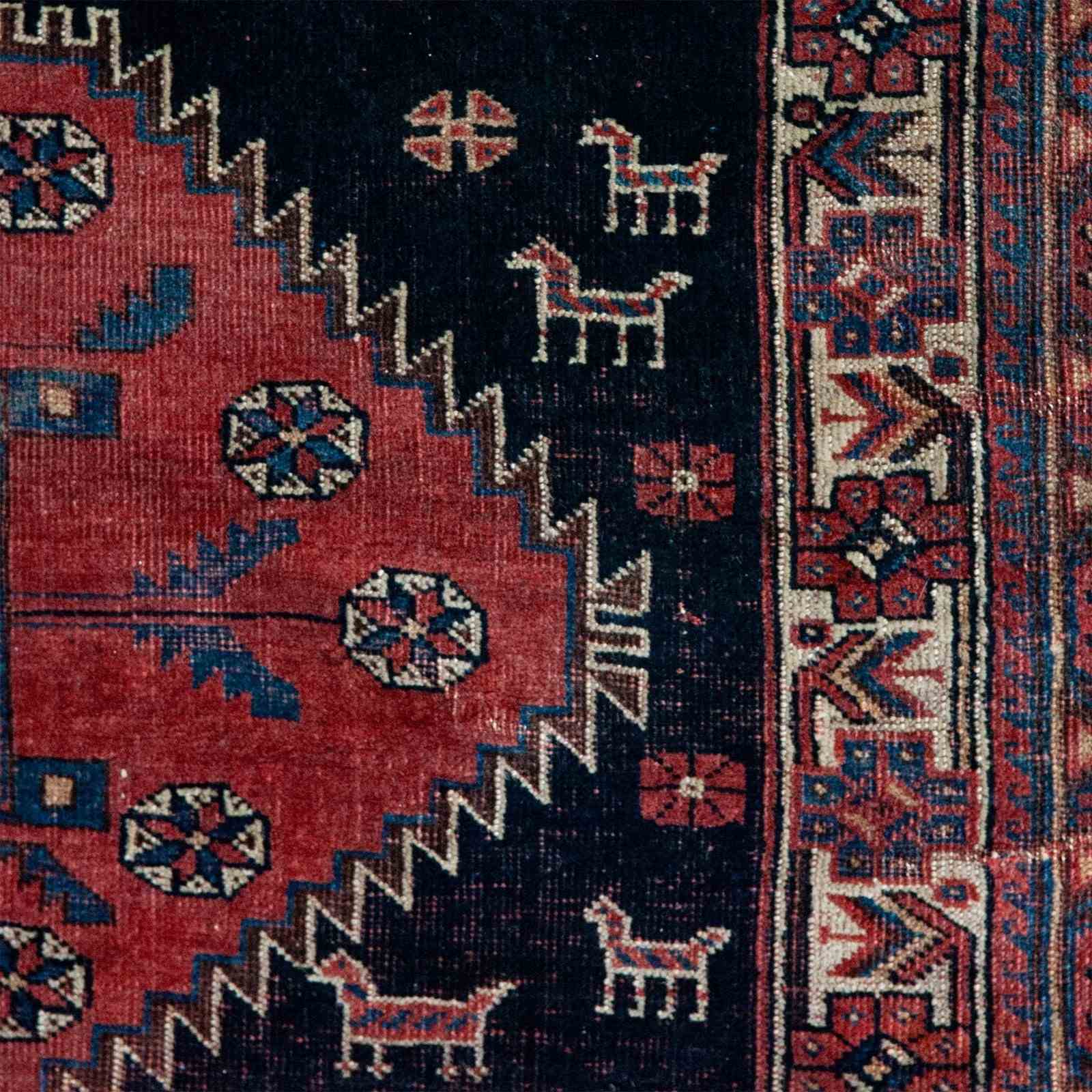 This hand-knotted wool rug, produced by Afshar weavers of South Persia, presents a rare tribal composition centred on a stepped medallion filled with stylised rosettes, angular leaf forms, and a finely drawn inner panel. Surrounding the medallion are scattered animal figures and geometric rosettes set against a deep indigo field, creating a lively, asymmetric rhythm typical of older Afshar nomadic work. The palette is built on saturated madder red, soft mineral blues, and ivory highlights, all mellowed through age into a rich, cohesive surface. Repeating rosettes, serrated outlines, and compact knotting reveal a disciplined yet expressive design vocabulary rooted in late 19th to early 20th-century South Persian weaving. Wear, perimeter fraying, and visible foundation at points reflect long domestic use, adding authenticity to its character. This piece offers a distinctive historic presence, blending bold geometry with a warm, time-softened aesthetic that suits settings seeking texture, history, and genuine tribal craftsmanship.