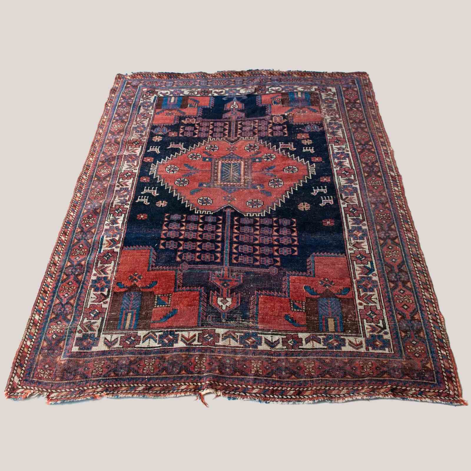 Not applicable; the textile shows expected age wear, including pile reduction, edge fraying, and a small central loss consistent with an antique tribal rug.
