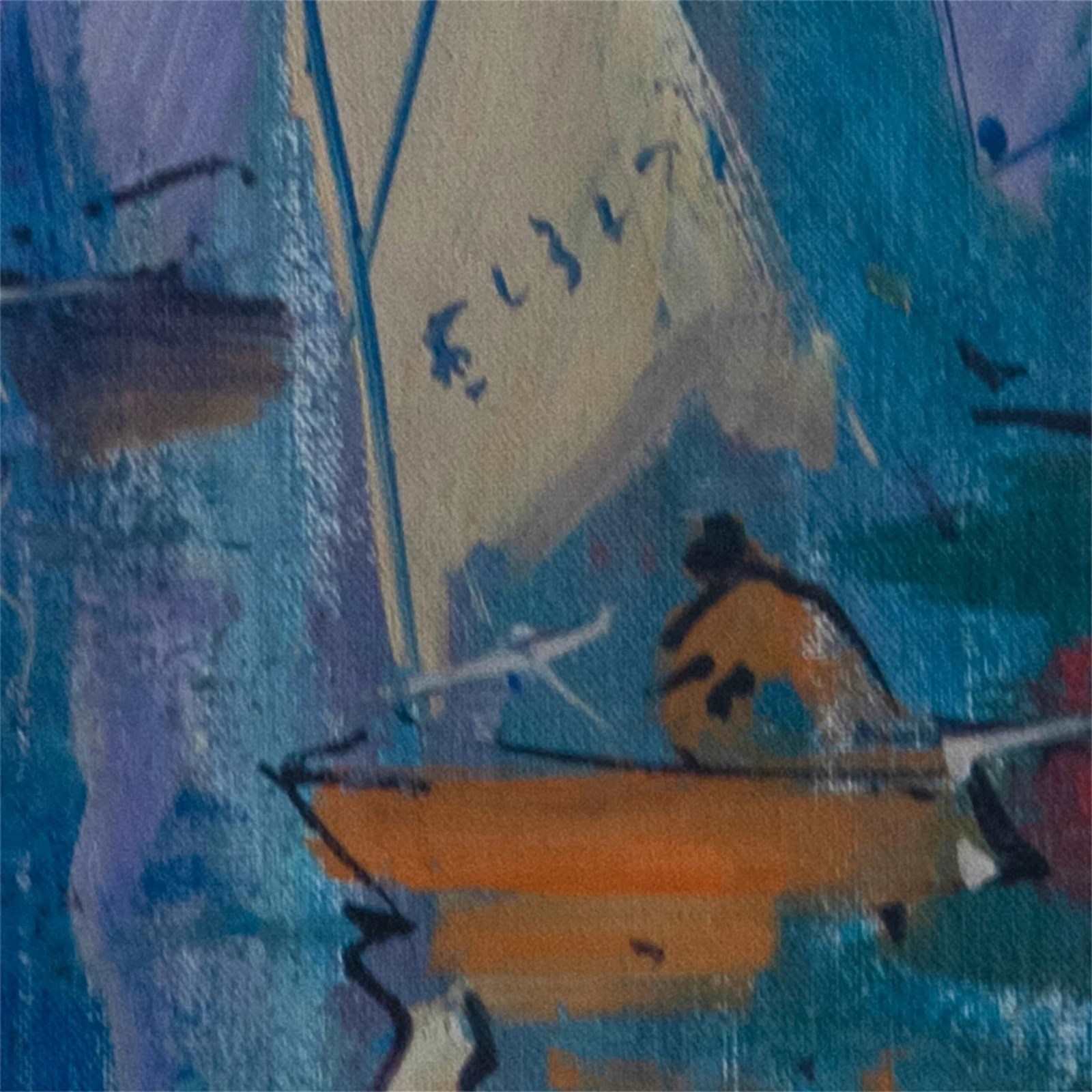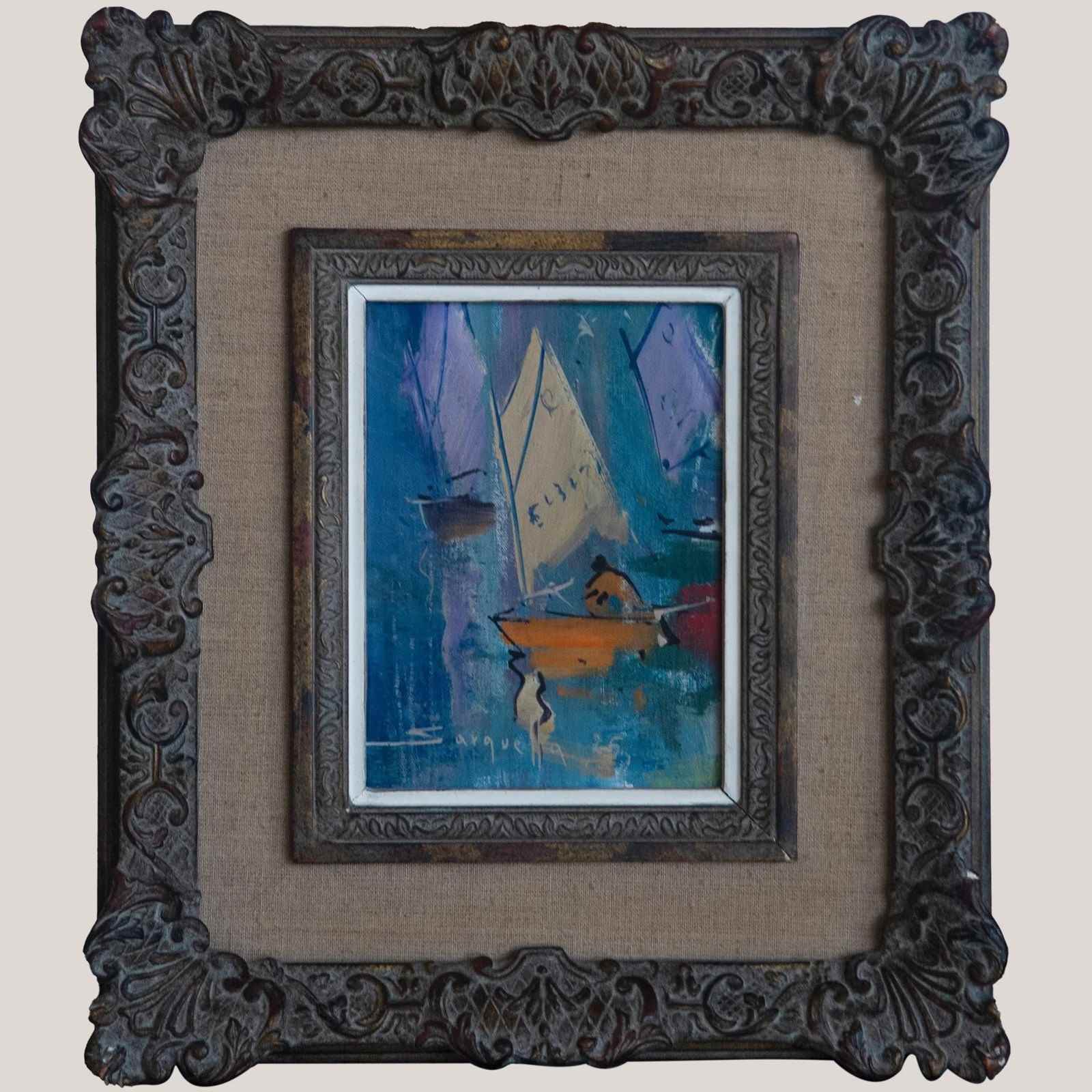 This vibrant oil on canvas by Catalan painter Josep Sarquella i Escobet captures the lively energy of sailboats moored in a Mediterranean harbor. Sarquella’s signature style—expressive brushwork, luminous color, and a fluid, gestural rhythm—imbues the scene with immediacy and motion. The sails, rendered in soft yellows and violets, shimmer against a turquoise sea that reflects the changing coastal light of the Costa Brava. His use of quick, confident strokes and saturated hues evokes the fleeting brilliance of sun and water, while maintaining a sense of compositional harmony. Rooted in the Mediterranean Post-Impressionist tradition, the painting conveys the artist’s lifelong fascination with maritime life and his mastery in translating atmosphere into color and texture. Its radiant palette and poetic spontaneity make it a striking piece for refined modern interiors seeking both warmth and vitality.