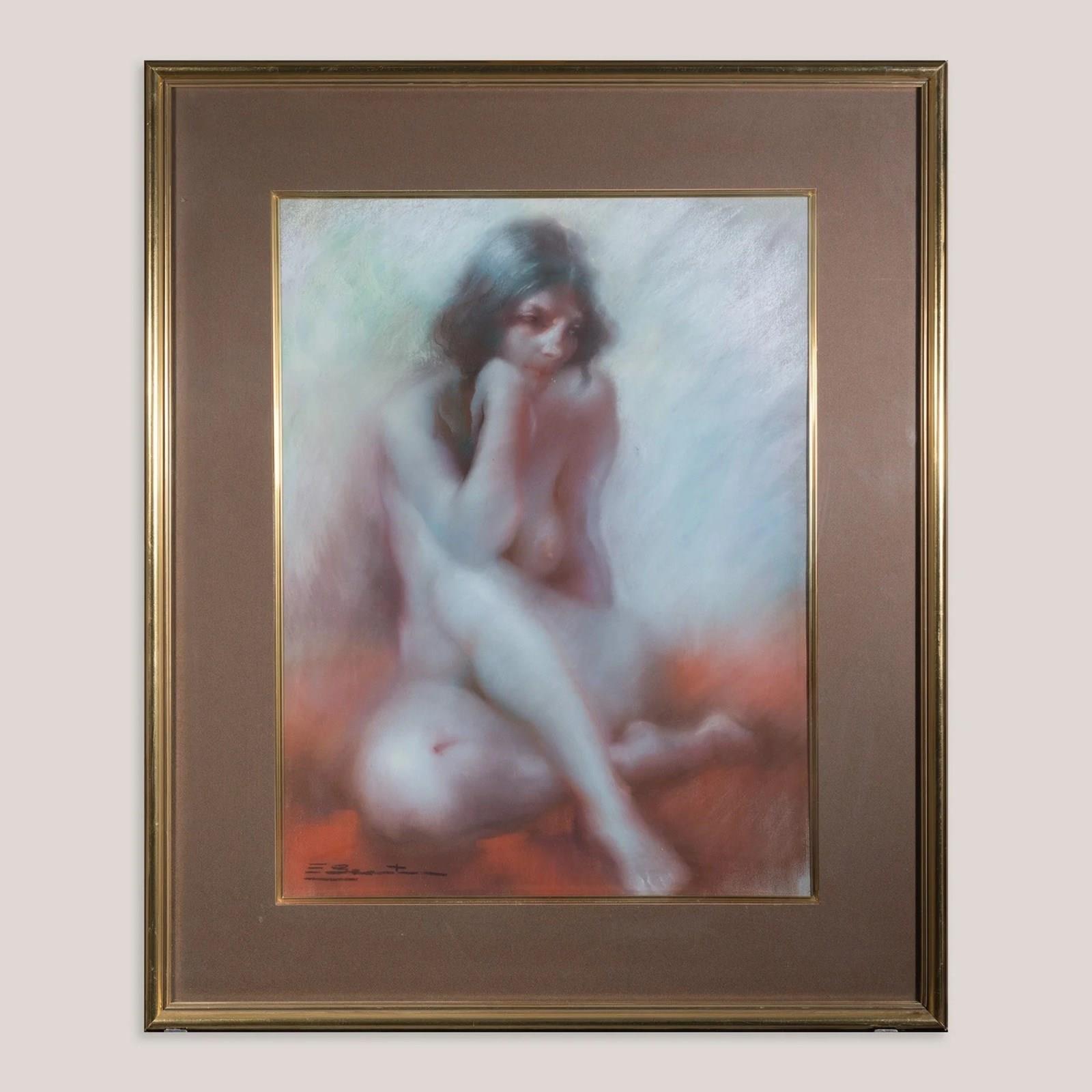 This signed pastel study depicts a seated female nude rendered with soft tonal transitions and a restrained palette of pale blue, warm rose, and muted terracotta. The figure is shown in a contemplative pose, her head resting gently against her hand while the body curves naturally across the composition. Subtle blending and delicate shading soften anatomical contours, creating an atmospheric and intimate figure study. The simplified background and diffused light emphasize the quiet mood and painterly handling typical of academic pastel figure sketches.