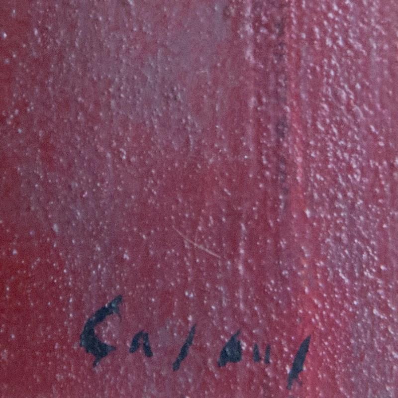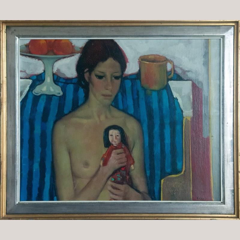 This evocative oil on canvas signed Calon presents an intimate composition of a seated nude woman tenderly holding a small doll, set against a vividly patterned blue background. The artist’s use of soft, diffused lighting creates a serene yet introspective atmosphere, drawing attention to the emotional connection between subject and object. The palette balances natural flesh tones with striking accents of red, gold, and turquoise, emphasizing both the warmth and melancholy of the scene. The still-life elements—a fruit bowl and a yellow cup—enhance the domestic intimacy while subtly framing the central figure. The painting’s quiet emotional resonance, disciplined brushwork, and strong compositional structure place it within the figurative modernism of mid-20th-century European painting, where realism meets psychological depth. This work offers a striking and contemplative focal point suitable for refined interiors.