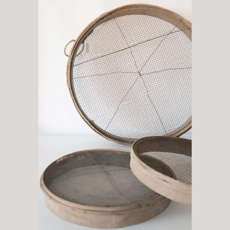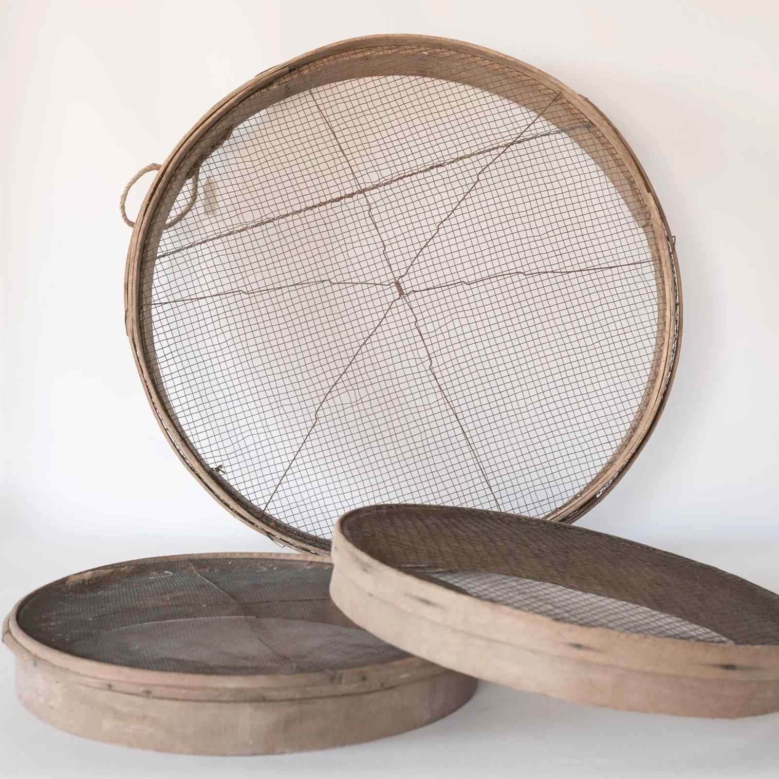 This vintage set of three wooden grain sieves showcases hand-crafted bentwood frames and finely woven wire mesh, reflecting traditional rural utility design. Each circular form displays a softly weathered surface with warm honeyed tones and subtle variations in patina, complemented by naturally oxidized metal grids. The visible rope handles and reinforcing wires emphasize their authentic working origins, while the repetition of form creates a visually balanced and sculptural grouping. Originally used for sifting flour and grain, these early 20th-century agricultural tools now function as striking decorative objects, defined by honest materials and restrained geometry. Their organic textures and neutral palette align seamlessly with rustic, wabi-sabi, and minimalist interiors, offering depth, history, and tactile character to curated residential or commercial spaces.