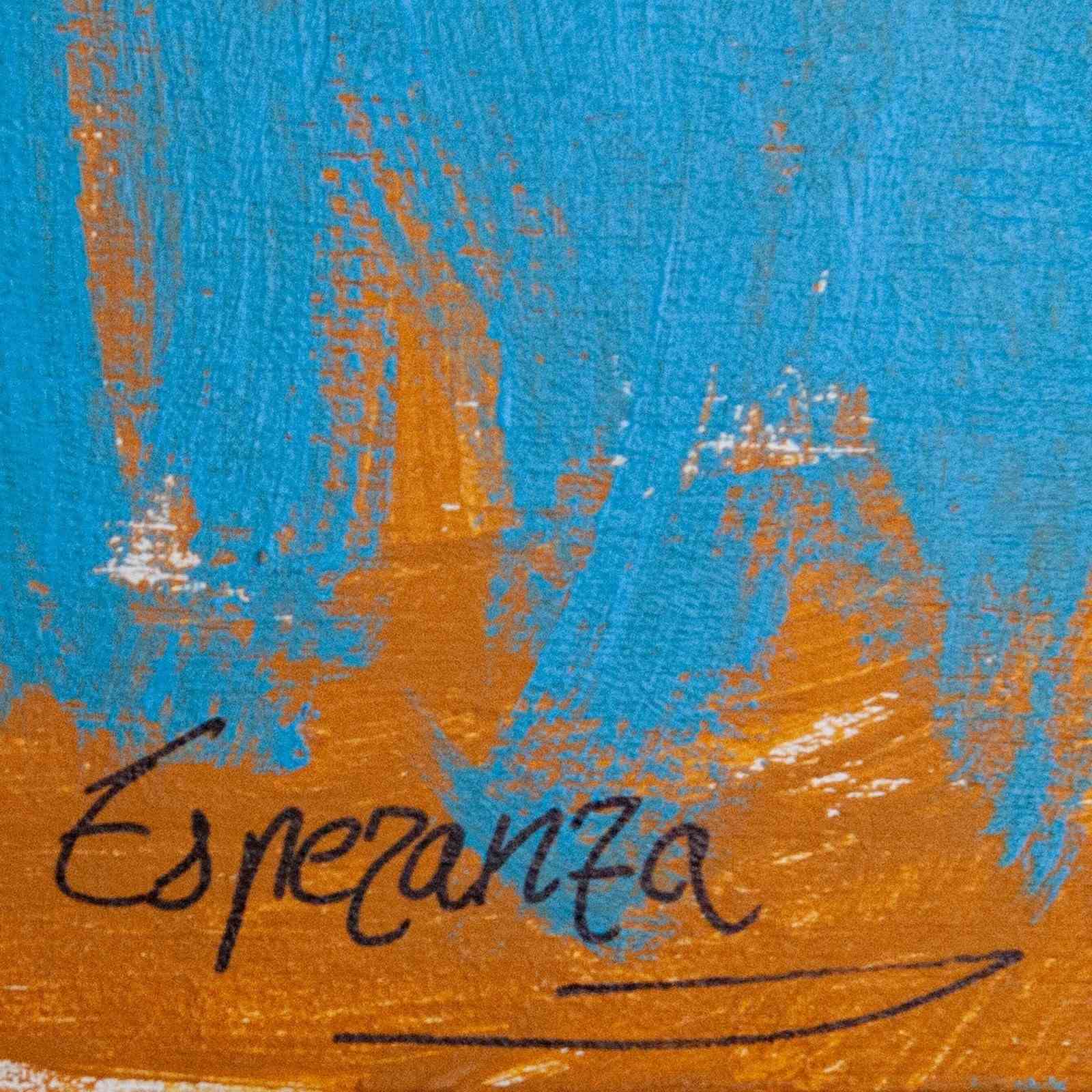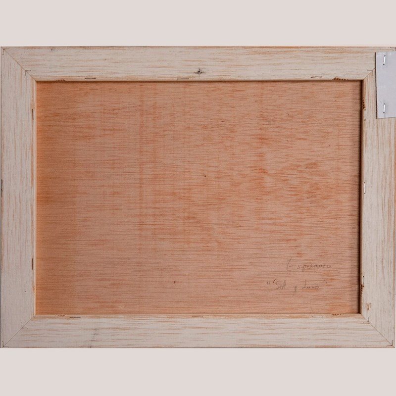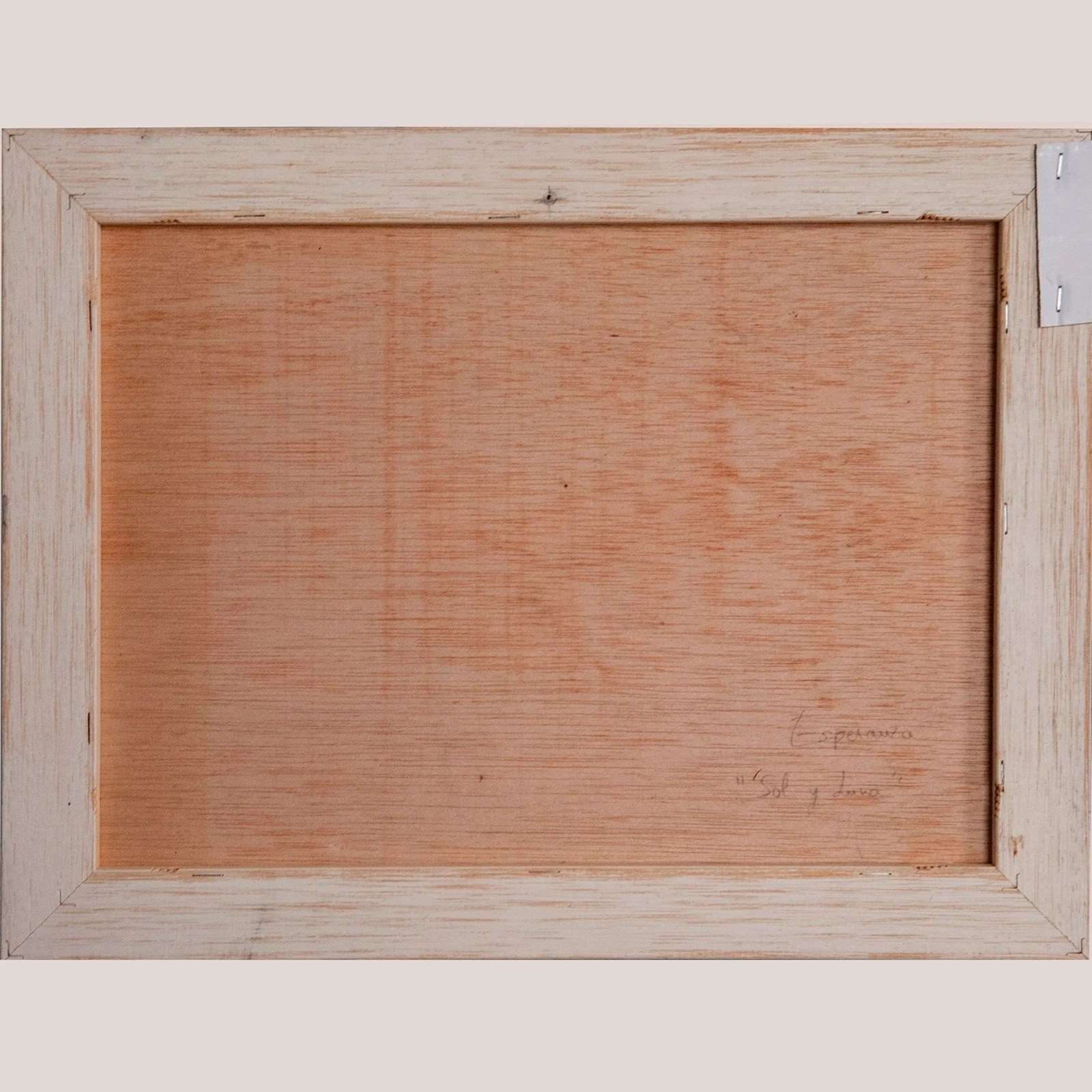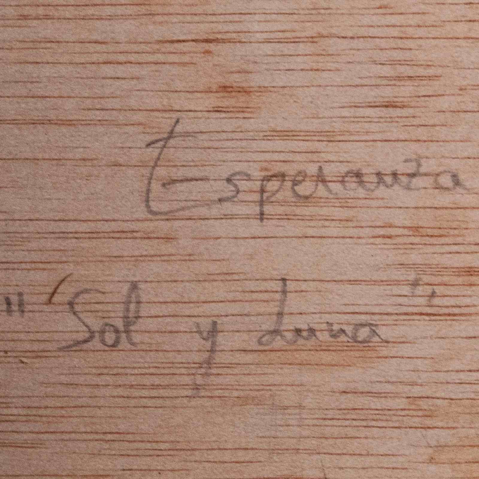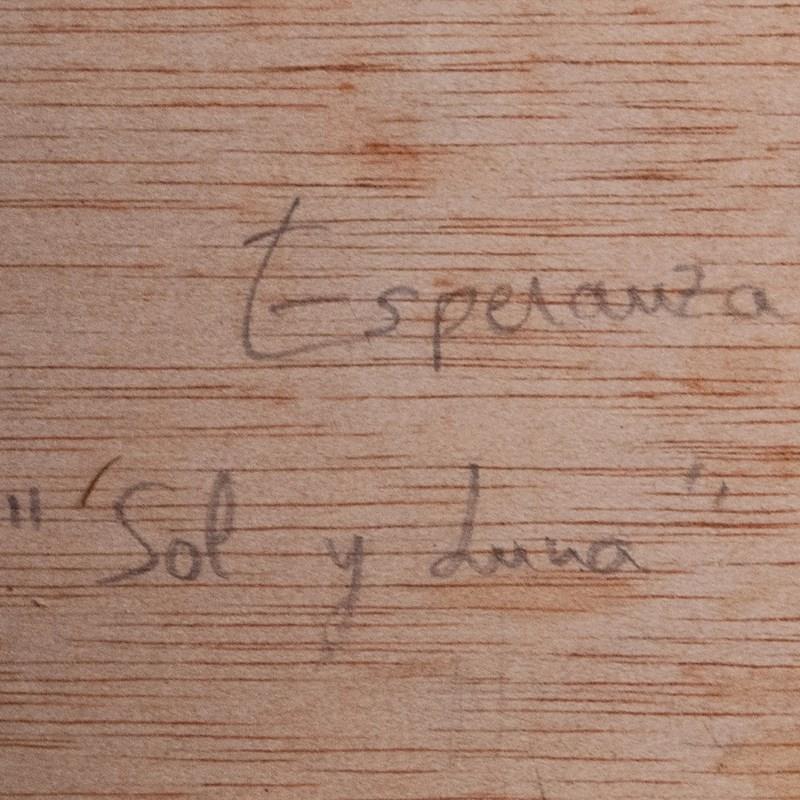 Though the artist remains unidentified, the signature “Esperanza” and the inscription “Sol y luna” suggest a painter with roots in the modern Spanish abstract movement. The bold color contrasts and simplified geometric rhythm evoke influences from postwar Mediterranean abstraction and lyrical expressionism.