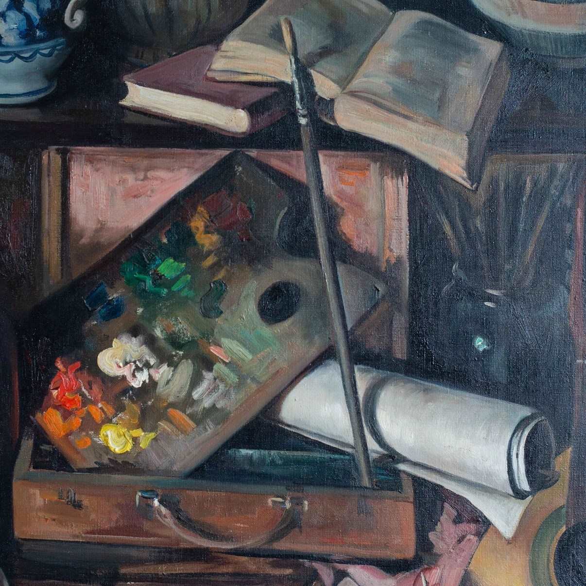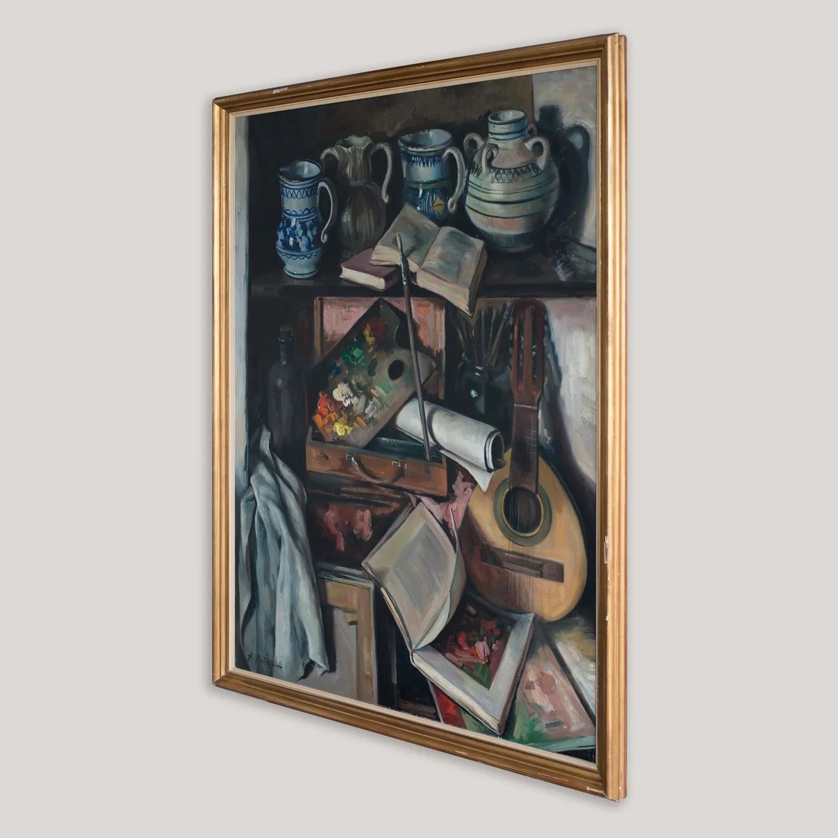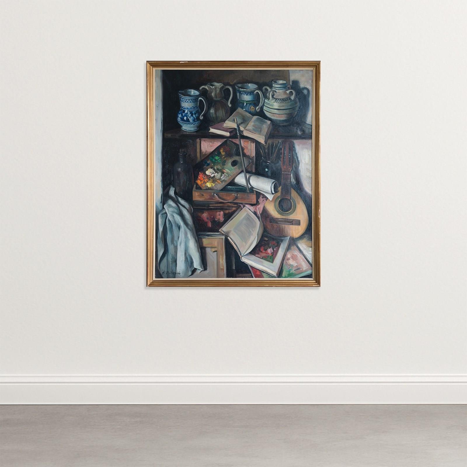 Alberto Muñoz Boquera presents a large oil on canvas still life depicting a studio arrangement of books, ceramics, a painter’s palette, and a guitar set within a shelving interior. The vertically structured composition organizes open volumes, rolled paper, glazed jugs, glass bottles, and a wooden instrument into a balanced, compartmentalized space. The palette is dominated by earthy browns, muted blues, olive greens, and warm ochres, with thicker paint application visible on the artist’s palette. Light enters from the right, creating soft shadow contrasts that define form and spatial depth. The subject and arrangement reflect a 20th-century European still life tradition focused on studio objects and controlled interior settings.