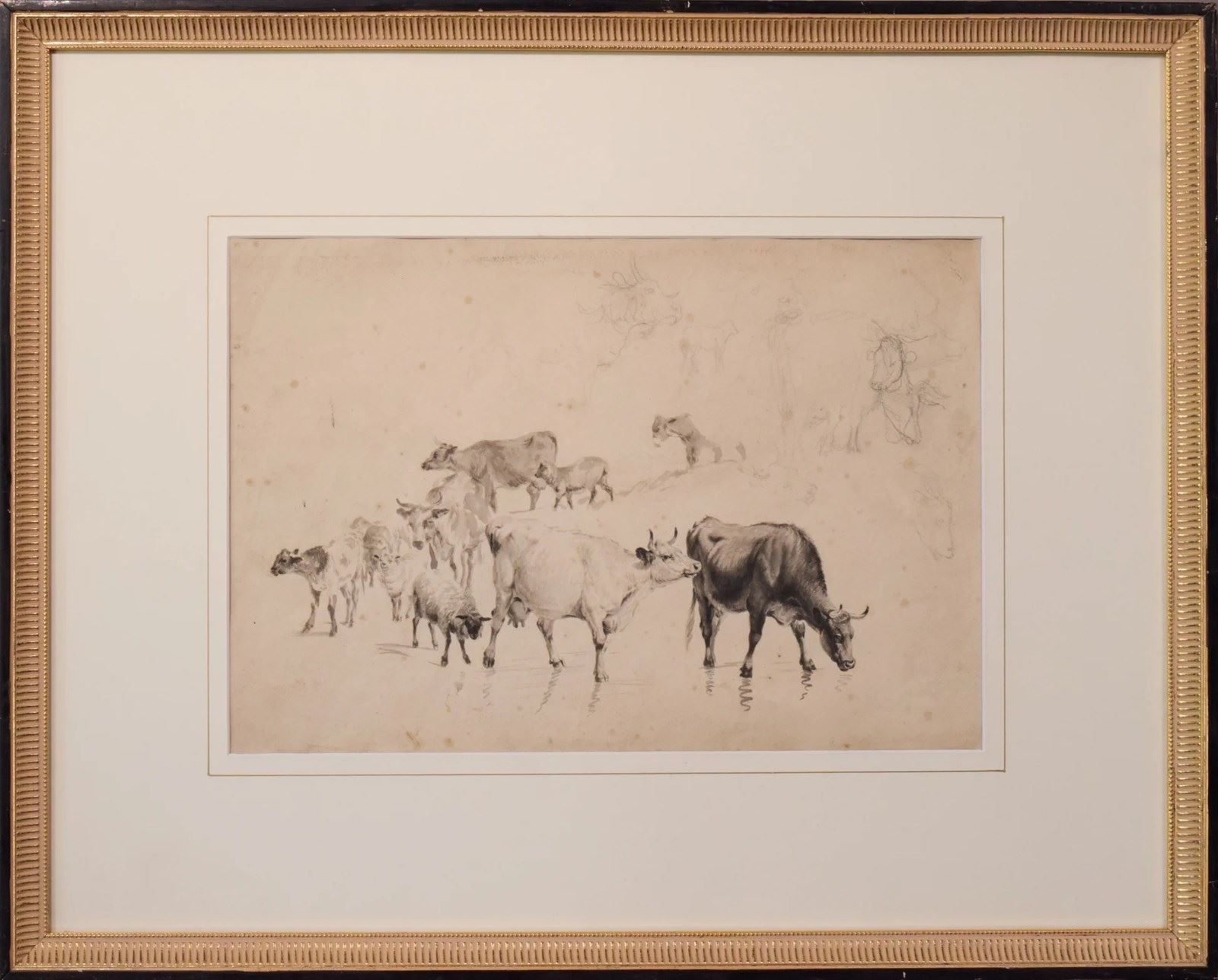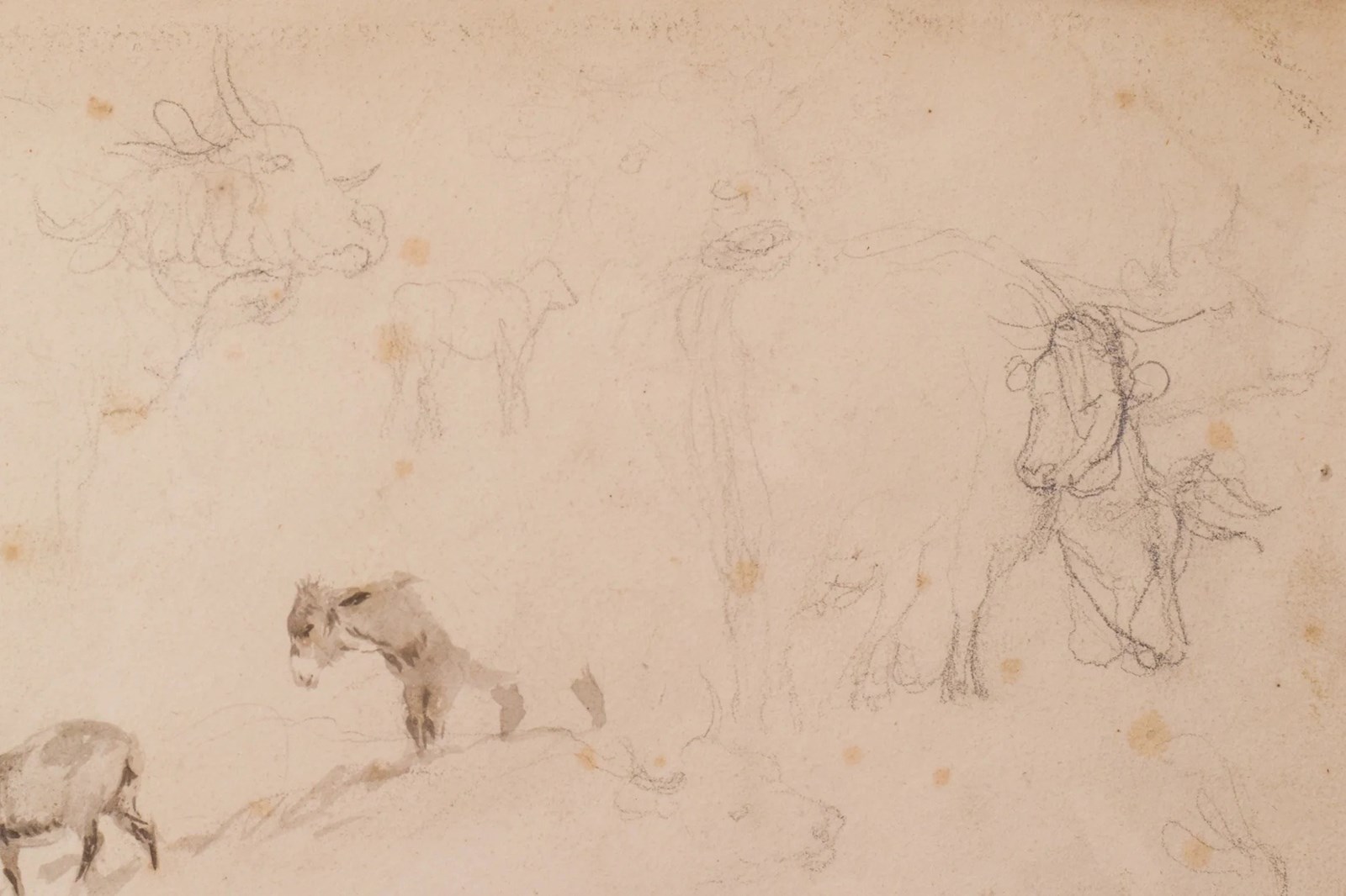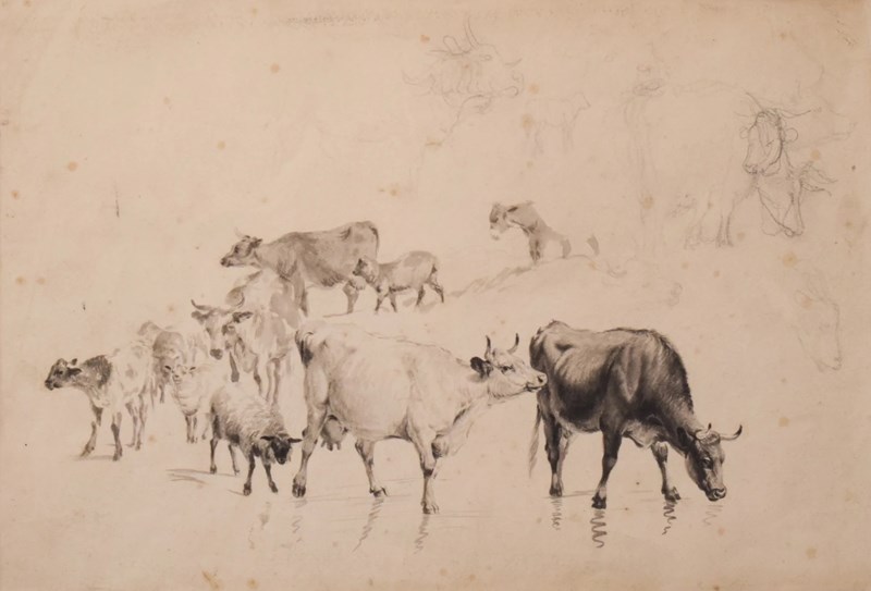 This captivating drawing allows us the privilege of seeing the artistic process at work. In this unique composition, a series of animals are shown trailing behind one another, each one in a slightly reduced stage of sketching, yet all magnificent in distinct ways. This finely executed pastoral drawing, attributed to Thomas Sidney Cooper or a close follower, captures a tranquil procession of cattle and sheep approaching water. Rendered in graphite and wash, it displays the assured technique and compositional harmony typical of Cooper’s school. Each animal advances in varying degrees of finish—from soft preliminary outlines to fully realized forms—revealing the artist’s disciplined observational method. The delicate tonal gradations and confident use of line convey both anatomical accuracy and gentle rural atmosphere. The composition closely parallels Troup of Cattle and Sheep Approaching a Ford Followed by a Woman on an Ass, held in the Dunedin Public Art Gallery, New Zealand