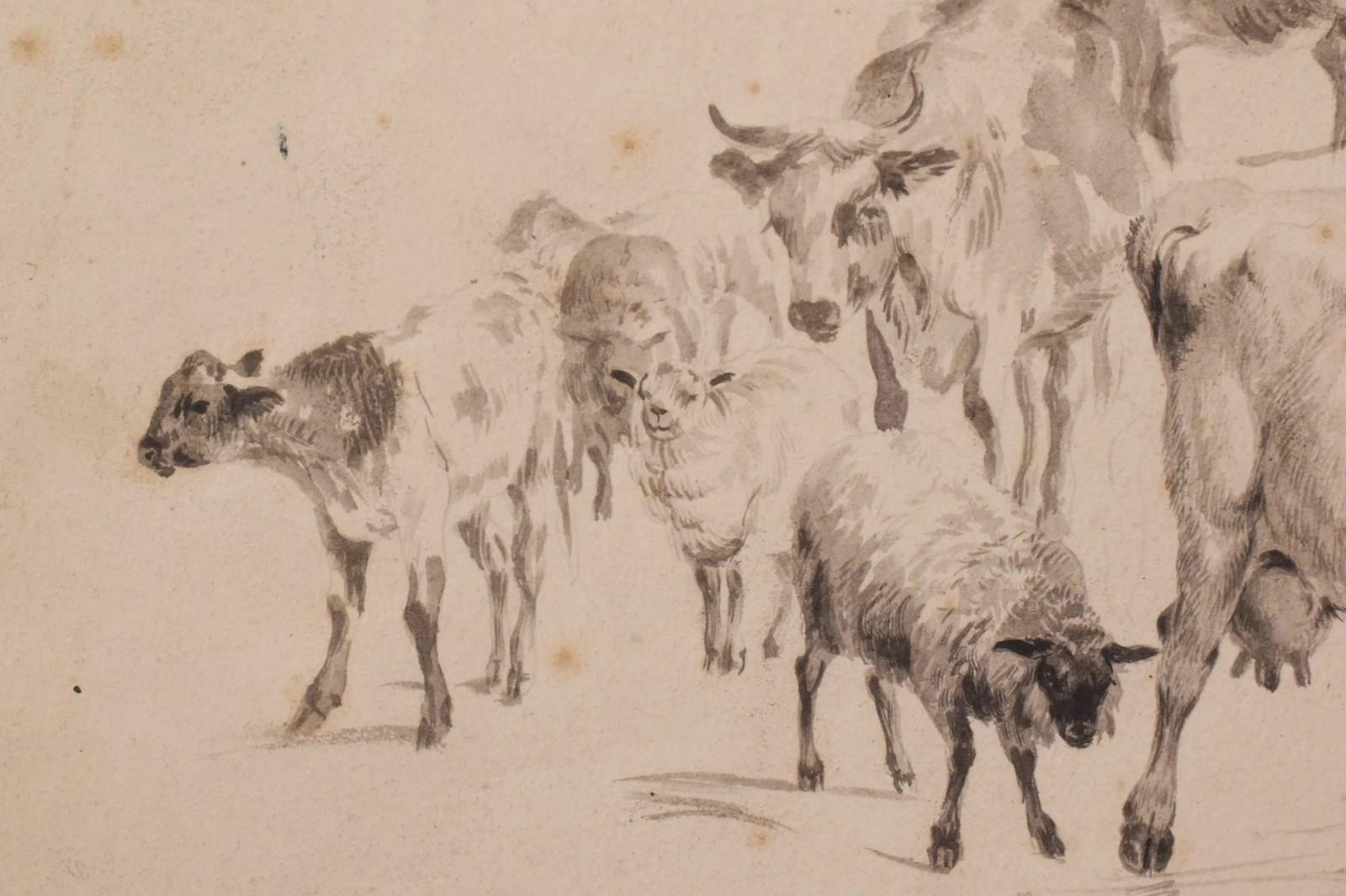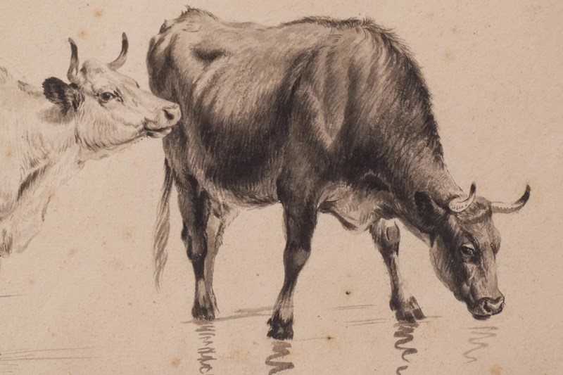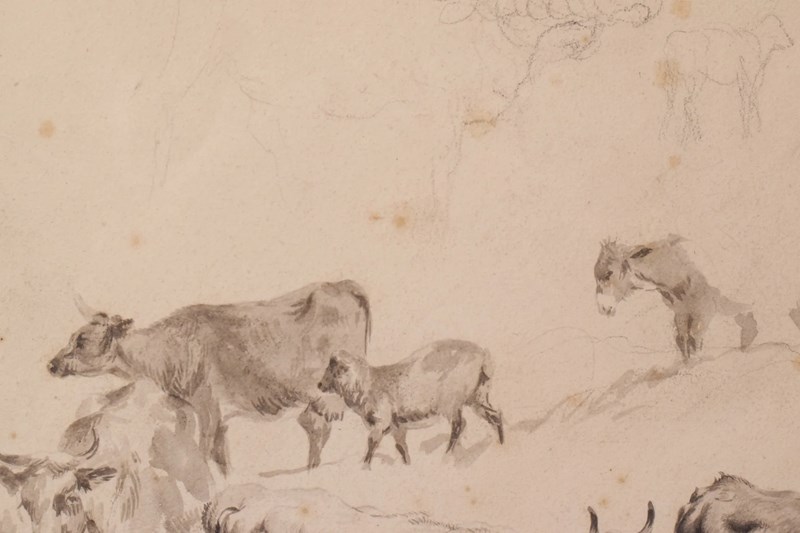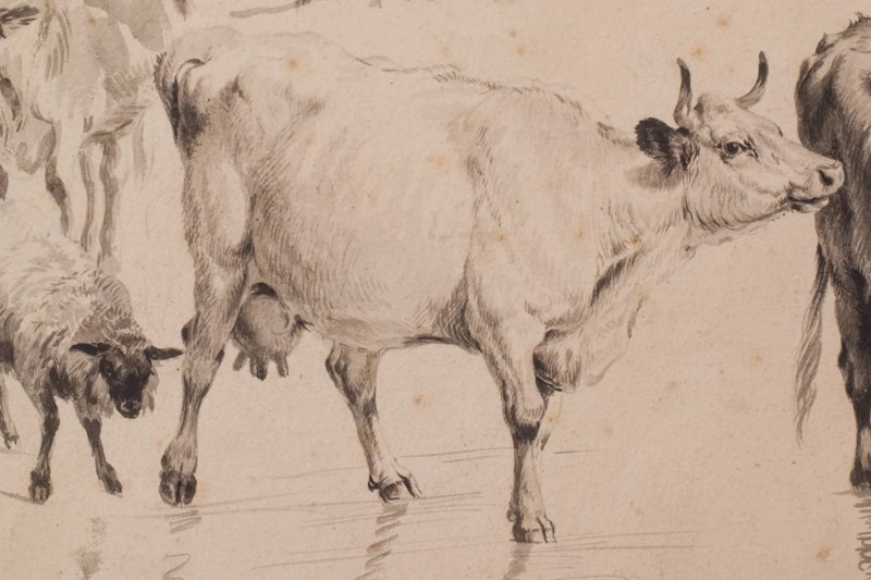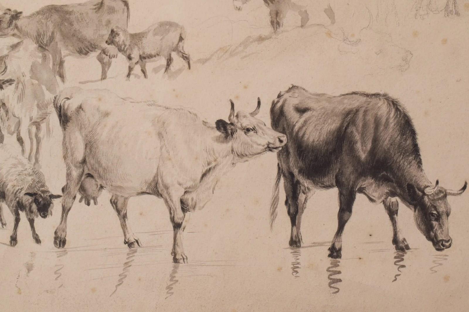 This captivating drawing allows us the privilege of seeing the artistic process at work. In this unique composition, a series of animals are shown trailing behind one another, each one in a slightly reduced stage of sketching, yet all magnificent in distinct ways. This finely executed pastoral drawing, attributed to Thomas Sidney Cooper or a close follower, captures a tranquil procession of cattle and sheep approaching water. Rendered in graphite and wash, it displays the assured technique and compositional harmony typical of Cooper’s school. Each animal advances in varying degrees of finish—from soft preliminary outlines to fully realized forms—revealing the artist’s disciplined observational method. The delicate tonal gradations and confident use of line convey both anatomical accuracy and gentle rural atmosphere. The composition closely parallels Troup of Cattle and Sheep Approaching a Ford Followed by a Woman on an Ass, held in the Dunedin Public Art Gallery, New Zealand