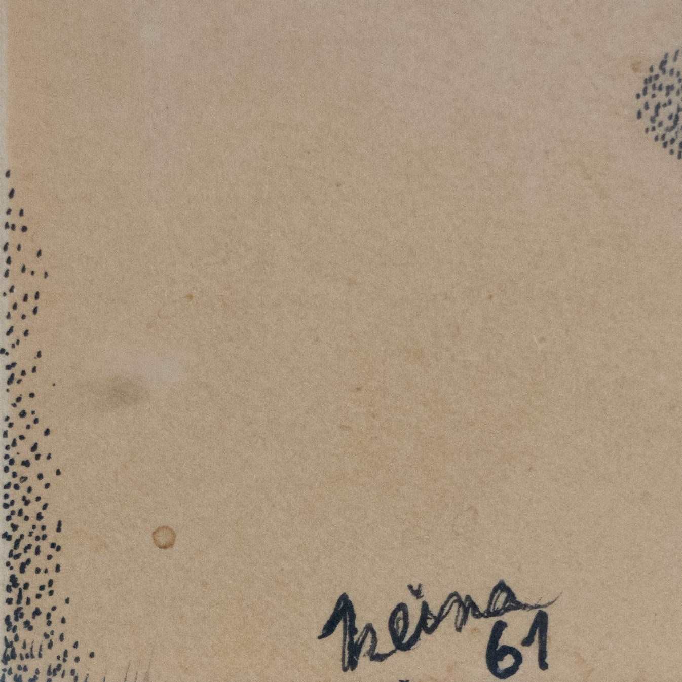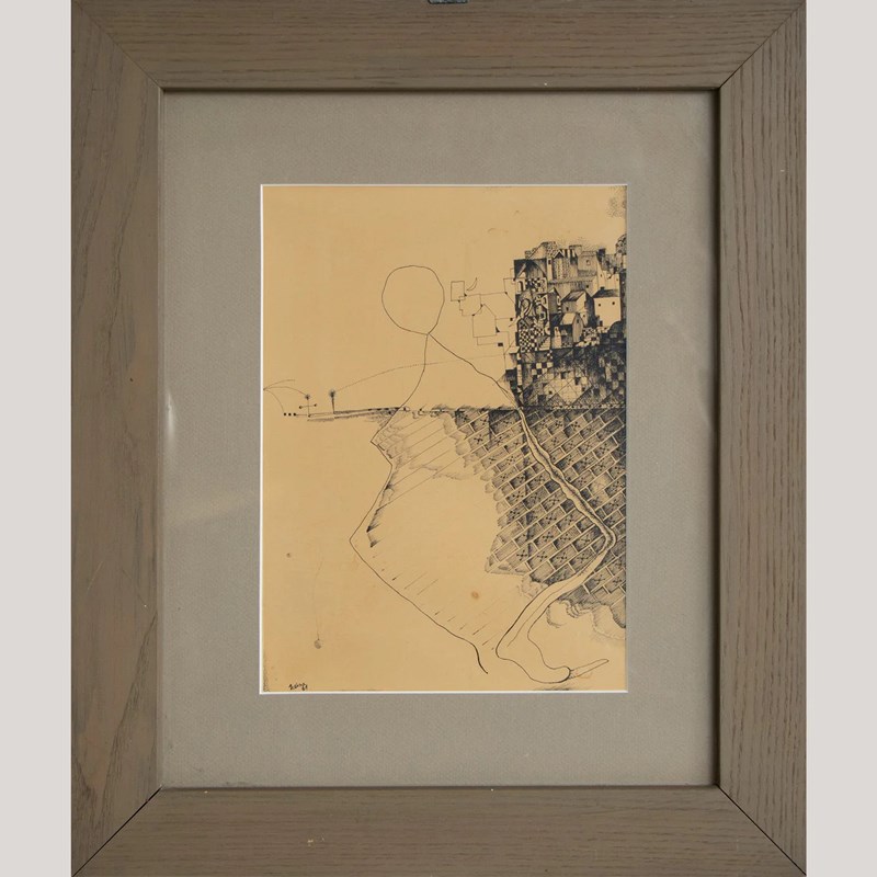 This original pen and ink drawing from 1961 presents a captivating surreal architectural landscape that merges geometric precision with imaginative abstraction. The artist constructs a complex cityscape of interwoven buildings, stairways, and textured grids, balanced against the minimal outline of a human form. The interplay between densely rendered detail and vast open space creates a dynamic visual rhythm, suggesting both structure and dreamlike suspension. Executed in fine black ink on aged paper, the composition demonstrates exceptional control of line, cross-hatching, and perspective, recalling the analytical approach of architectural draftsmen while evoking the poetic ambiguity of surrealism. The monochrome palette and meticulous technique give the piece an enduring modernity, inviting contemplation of order, balance, and the hidden architecture of thought.