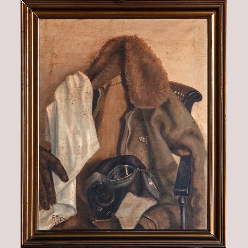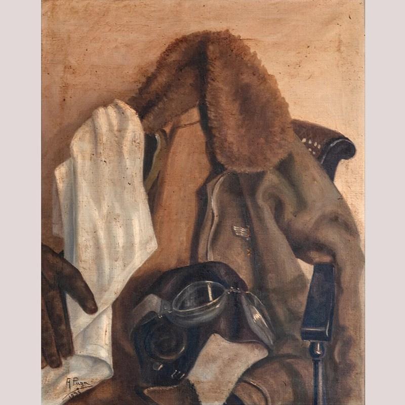 This rare 1953 study by A. Puga captures an evocative still life of an aviator’s gear—flight jacket, gloves, scarf, and goggles—arranged with quiet dignity. Executed in oil, the composition displays restrained tones of umber, ochre, and cream, highlighting the soft textures of leather and fabric against a muted background. Puga’s sensitive handling of light and brushwork gives the objects a sculptural solidity and a contemplative stillness, evoking post-war reflection and memory. The artist’s controlled realism and careful tonal harmony suggest both technical mastery and emotional depth. This is a fine example of mid-century Spanish realism, offering historical resonance and timeless visual balance for discerning spaces.
