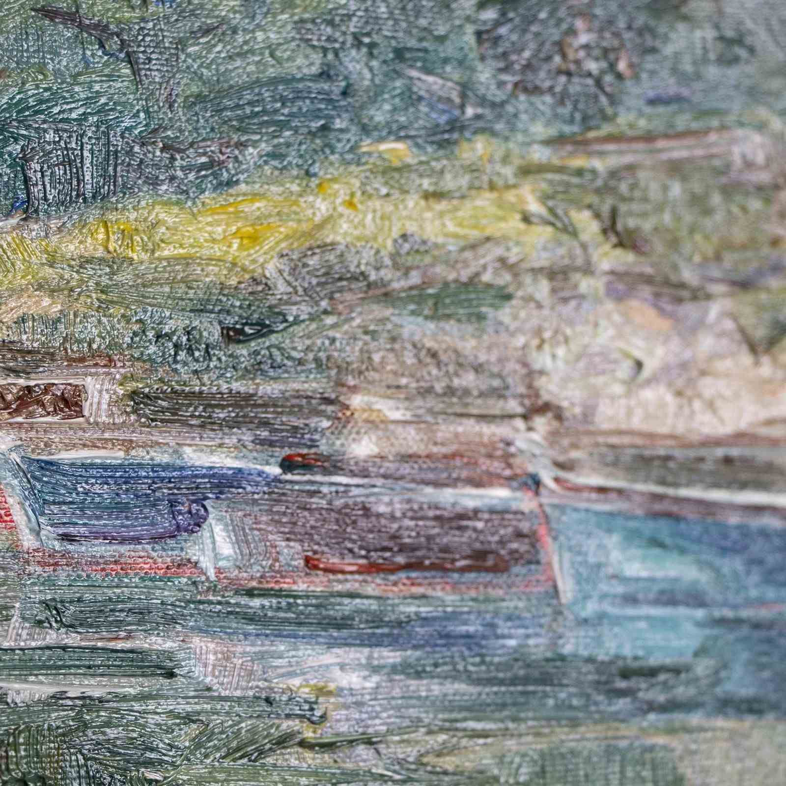 This signed oil on canvas, titled Transparencies, portrays a calm Mediterranean inlet where small fishing boats rest gently on clear, reflective waters. The artist employs loose, confident brushwork to convey the luminous stillness of the scene, allowing subtle tonal shifts of blue-green and ochre to express depth and atmosphere. The interplay of reflection and shadow on the water’s surface demonstrates refined control of light and composition. The painting’s balance of realism and painterly freedom reflects the influence of coastal impressionism, capturing the serenity and rhythm of everyday maritime life. Its tranquil palette and spatial clarity lend a timeless quality suited to both contemporary and classic settings.