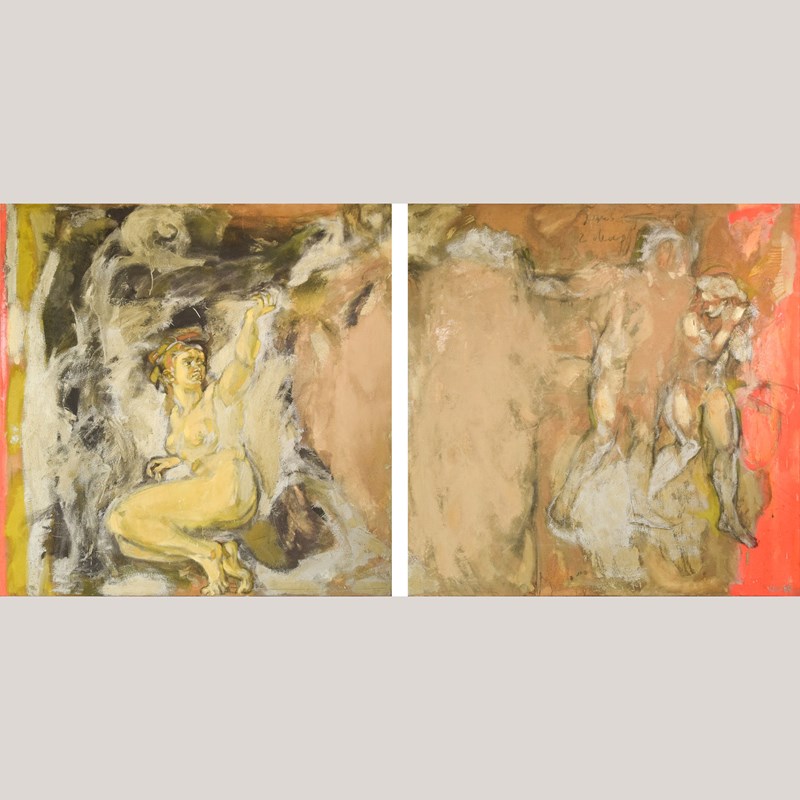 These magnificent dynamic pieces are painted with a frantic yet brilliant flair. Echoing the abstract expressionism of Willem de Kooning (1904-1997), this highly skilled artist paints with a unique spontaneity and freedom. The frantic, gestural brushstrokes create a dynamic ambience, allowing movement and energy to take over the medium. Drawing on classical imagery, a series of studies of the nude figure are depicted, surrounded by a chaotic, whirlwind-like atmosphere.