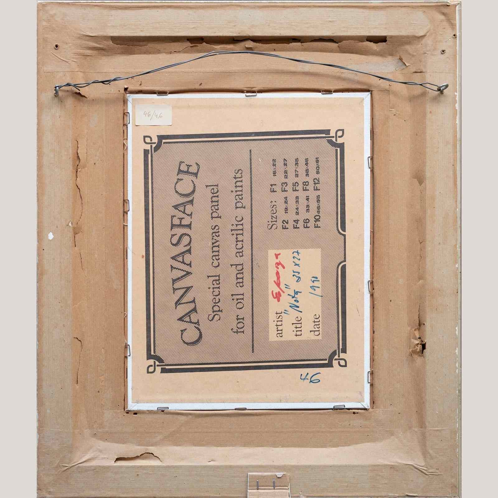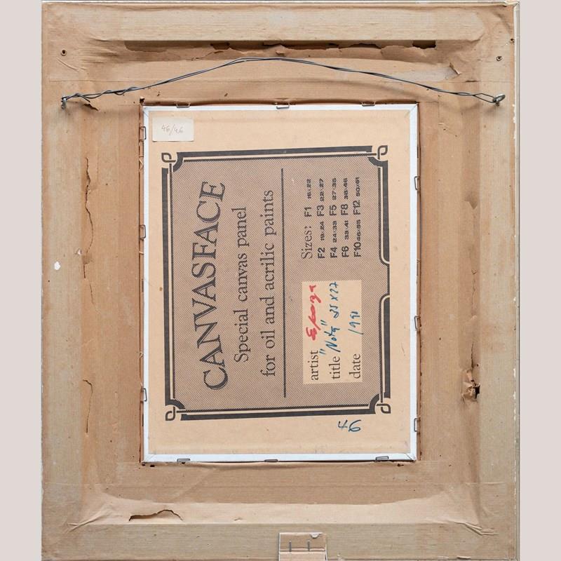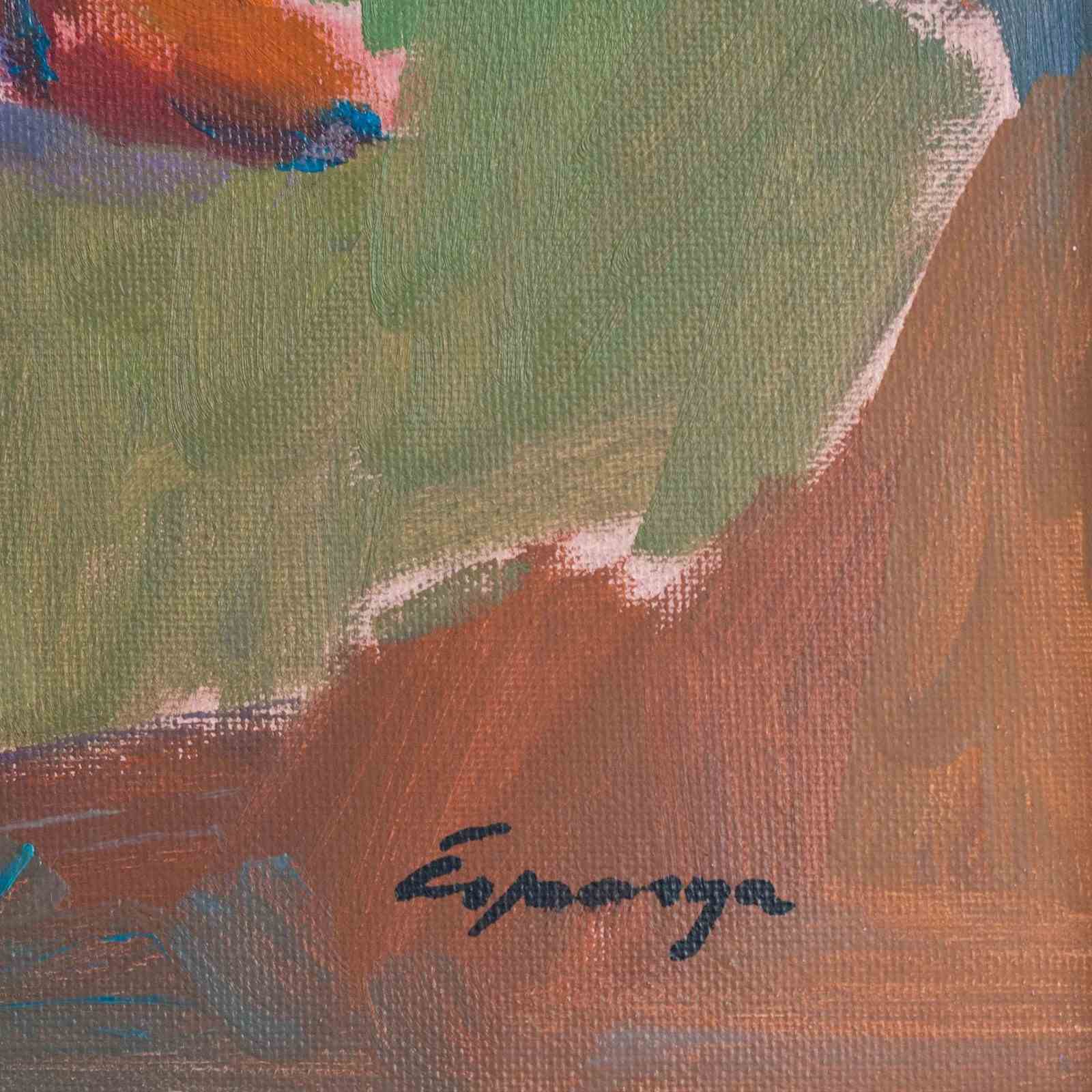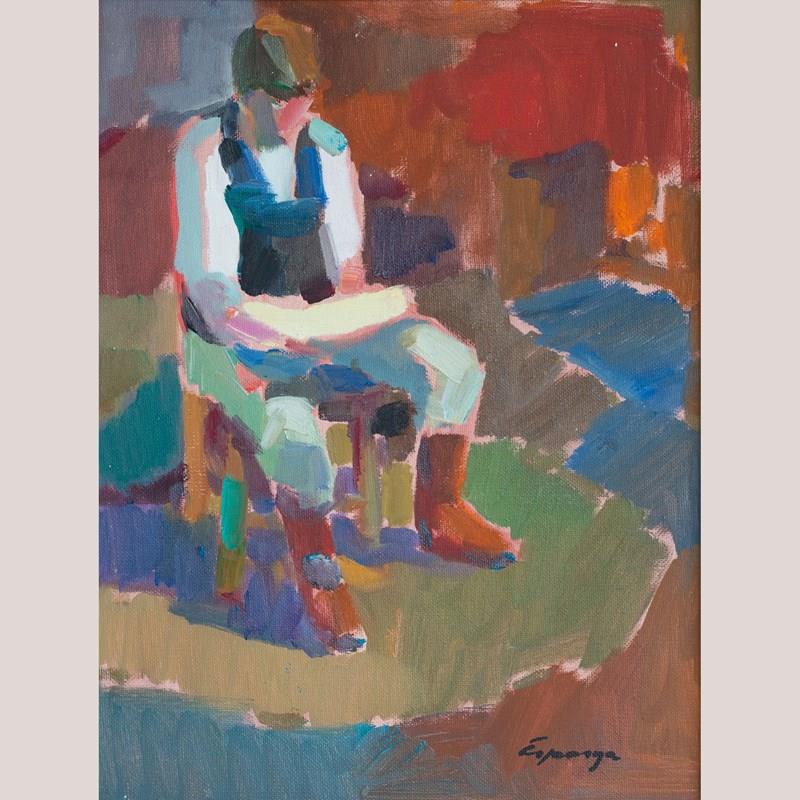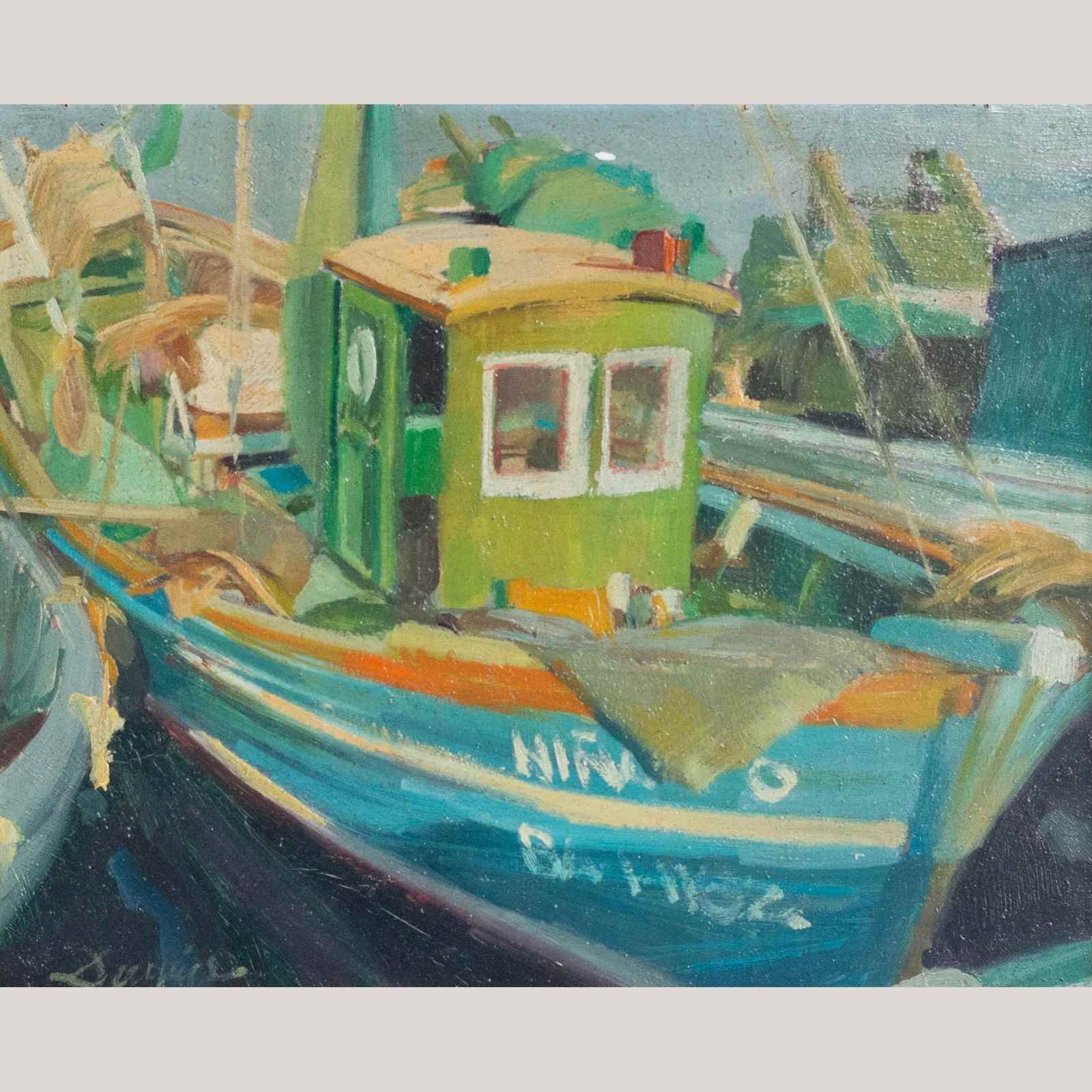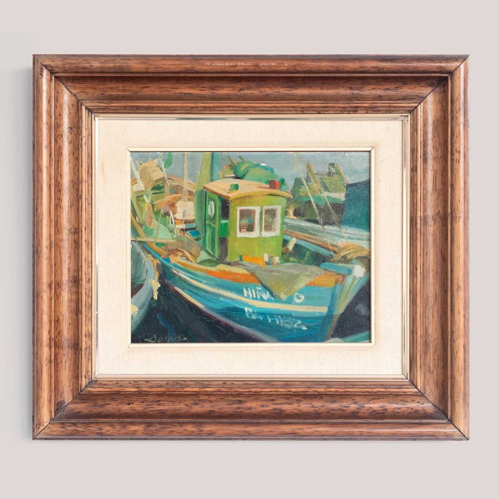 These two framed oil paintings, are presented as a cohesive pair and share a consistent painterly language marked by confident brushwork and strong color structure. One work depicts a moored fishing boat rendered in turquoise, green, and warm ochre tones, with expressive strokes suggesting movement and light within a harbor setting. The second painting presents a seated figure composed through broad planes of color, where reds, blues, greens, and neutrals are balanced to define form rather than detail. In both works, the artists favors simplified shapes, visible brush marks, and a modern, post-impressionist approach that emphasizes mood and composition over realism.