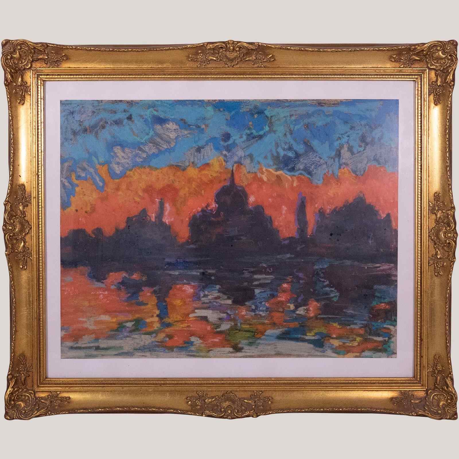 This oil on carton painting captures a glowing Venetian sunset rendered with expressive color and light in the tradition of Late Impressionism. Its style shows a clear affinity with Claude Monet, whose Venetian series explored the interplay of atmosphere and reflection. Like Monet and his contemporaries—heirs to Turner’s poetic luminosity—the artist transforms the scene into a synthesis of color, mood, and motion. Fiery tones of orange and red merge with cool blues and violets, creating striking contrasts that radiate across the water’s surface. Loose, fluid brushstrokes dissolve the domes and towers of Venice into vibrant silhouettes, their reflections shimmering in rhythmic harmony. The composition evokes views of the Grand Canal or the Basilica di Santa Maria della Salute at sunset, where architectural form yields to the brilliance of light. The result is an image of serene intensity—less a depiction of place than a lyrical impression of a fleeting moment.