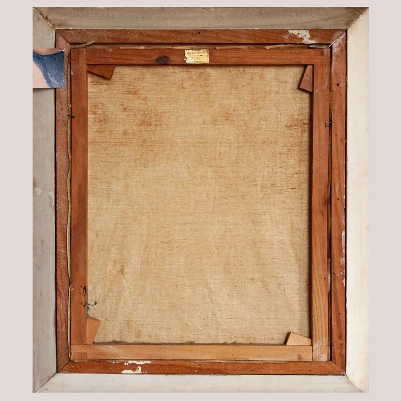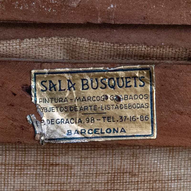 Although the signature remains indecipherable, stylistic and technical traits link the painting to the Catalan post-impressionist school. The label from Sala Busquets, a well-known Barcelona gallery and frame-maker on Passeig de Gràcia, confirms its likely regional origin and period framing.