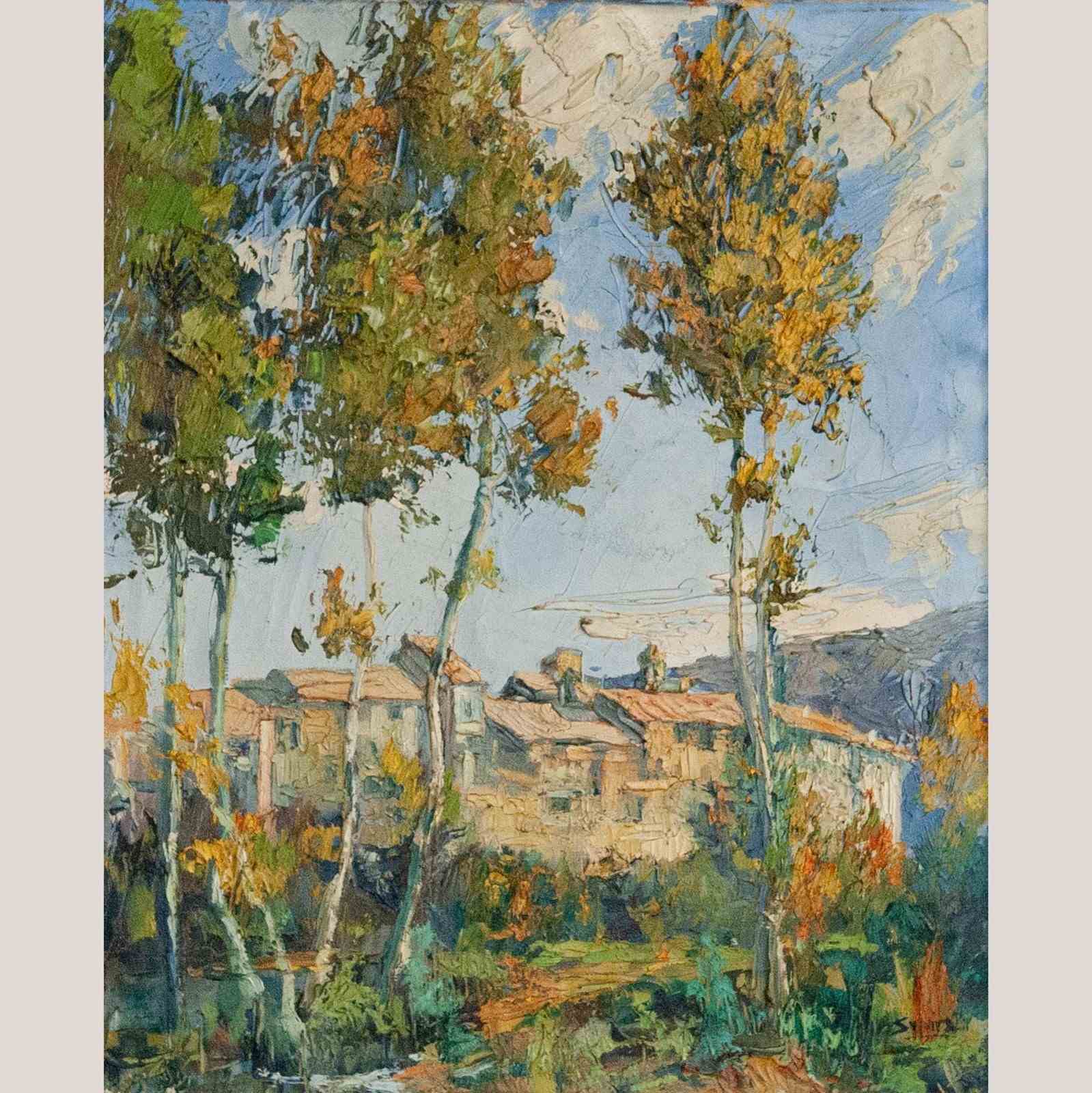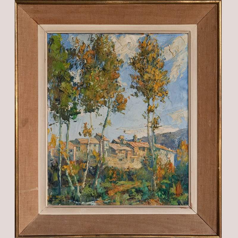 This expressive oil painting portrays a peaceful village framed by tall trees beneath a radiant sky. Executed with vigorous impasto brushwork, the surface reveals thick, confident layers of green, ochre, and blue, giving depth and movement to the composition. The clustered rooftops and shifting foliage capture the luminous character of the Mediterranean countryside, balancing texture and harmony in a way typical of mid-20th-century Catalan landscape painting. The work’s vivid palette and balanced spatial arrangement suggest an accomplished artist with a refined sense of atmosphere and light.