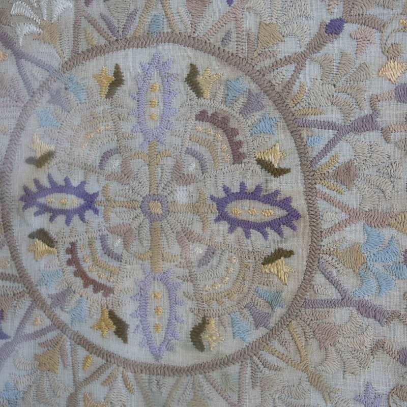 This exquisite vintage embroidered sampler is a masterwork of hand-stitching and traditional textile craftsmanship. The composition features a central medallion surrounded by intricate floral and foliate motifs in delicate tones of lavender, gold, sky blue, and soft taupe. Each stitch reveals remarkable precision, with satin and stem stitches creating depth and texture against the natural linen ground. The symmetrical design evokes early European or Mediterranean embroidery traditions, where ornamental patterning conveyed artistry and cultural heritage. Its gentle patina, consistent with age, enhances the authenticity and tactile beauty of the textile. Displayed within a simple vintage whitewashed frame, this piece offers a rare fusion of historic charm and refined decorative appeal—an elegant testament to the artistry of domestic needlework in the early twentieth century.